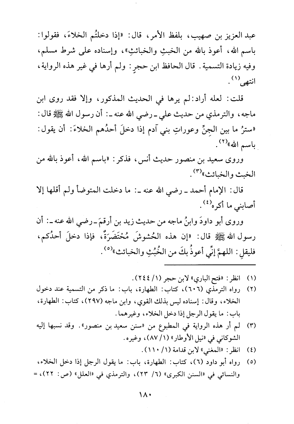 (٥) رواه أبو داود (٦)، كتاب: الطهارة، باب: ما يقول الرجل إذا دخل الخلاء، والنسائي في "السنن الكبرى" (٦/ ٢٣)، والترمذي في "العلل" (ص: ٢٢)، =