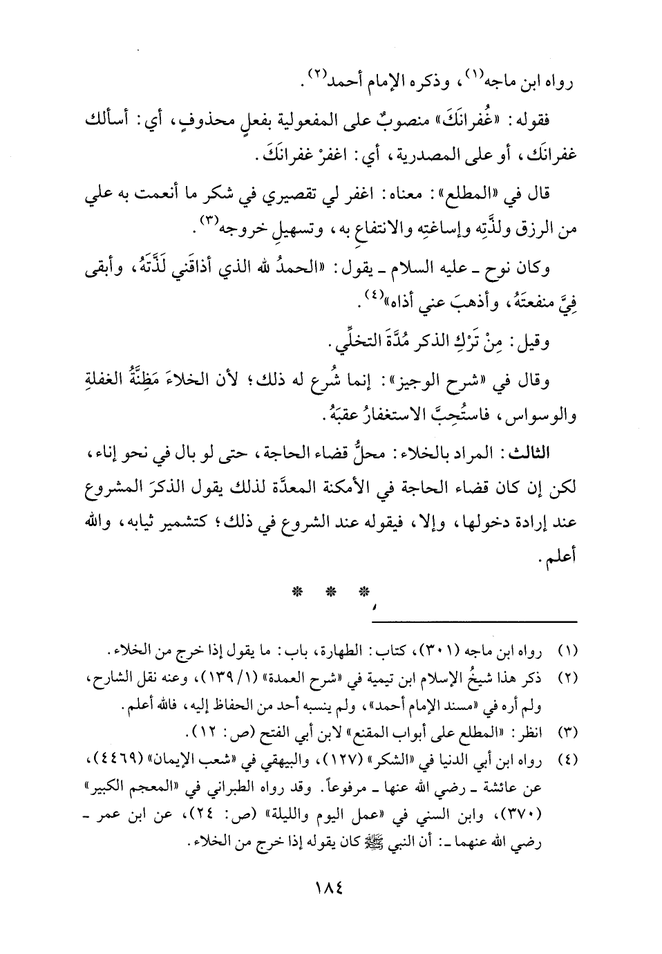 (٤) رواه ابن أبي الدنيا في "الشكر" (١٢٧)، والبيهقي في "شعب الإيمان" (٤٤٦٩)، عن عائشة - رضي الله عنها - مرفوعاً. وقد رواه الطبراني في "المعجم الكبير" (٣٧٠)، وابن السني في "عمل اليوم والليلة" (ص: ٢٤)، عن ابن عمر - رضي الله عنهما -: أن النبي - صلى الله عليه وسلم - كان يقوله إذا خرج من الخلاء.