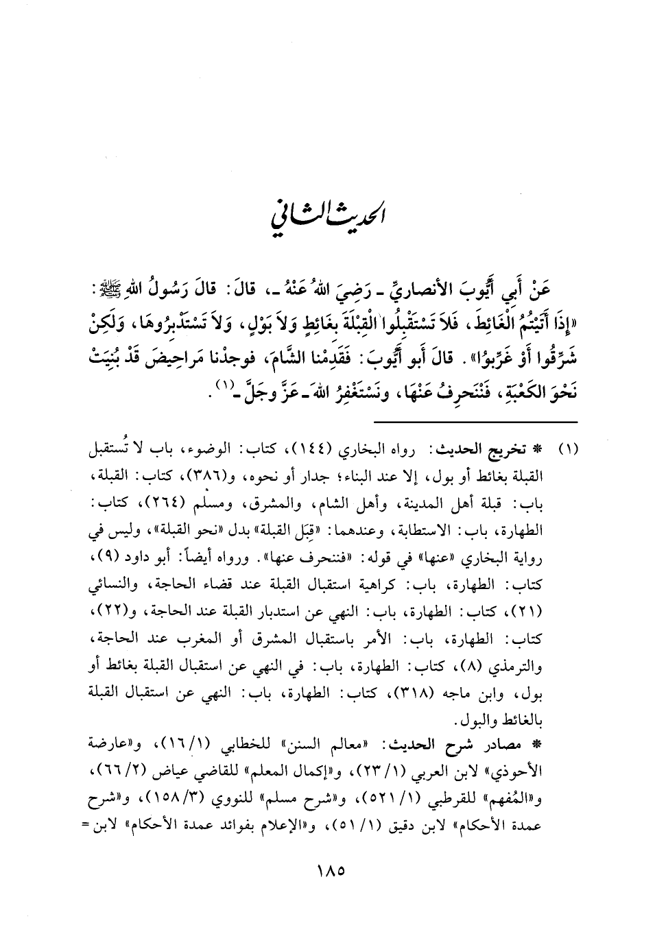 عَنْ أَبِي أَيُّوبَ الأنصاريِّ - رَضِيَ اللهُ عَنْهُ -، قالَ: قالَ رَسُولُ اللهِ - صلى الله عليه وسلم -: "إِذَا أَتَيْتُمُ الْغَائِطَ، فَلاَ تَسْتَقْبِلُوا الْقِبْلَةَ بِغَائِطٍ وَلاَ بَوْلٍ، وَلاَ تَسْتَدْبِرُوهَا، وَلَكِنْ شَرِّقُوا أَوْ غَرِّبوُا". قالَ أَبو أَيُّوبَ: فَقَدِمْنا الشَّامَ، فوجدْنا مَراحِيضَ قَدْ بُنِيَتْ نَحْوَ الكَعْبَةِ، فَنْنَحرِفُ عَنْهَا، ونَسْتَغْفِرُ اللهَ - عَزَّ وجَلَّ - (١).