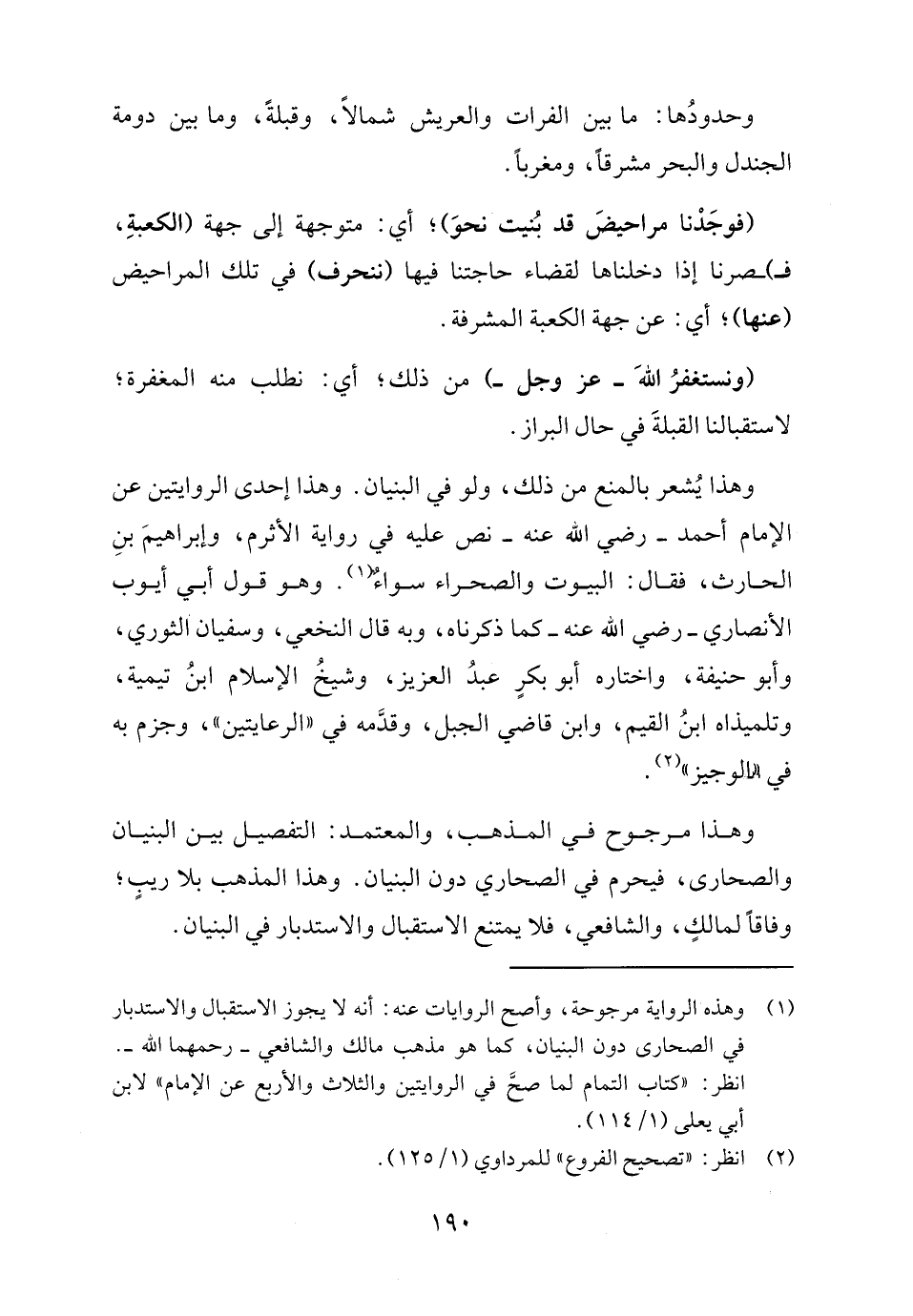 (١) وهذه الرواية مرجوحة، وأصح الروايات عنه: أنه لا يجوز الاستقبال والاستدبار في الصحارى دون البنيان، كما هو مذهب مالك والشافعي - رحمهما الله -. انظر: "كتاب التمام لما صحَّ في الروايتين والثلاث والأربع عن الإمام" لابن أبي يعلى (١/ ١١٤).