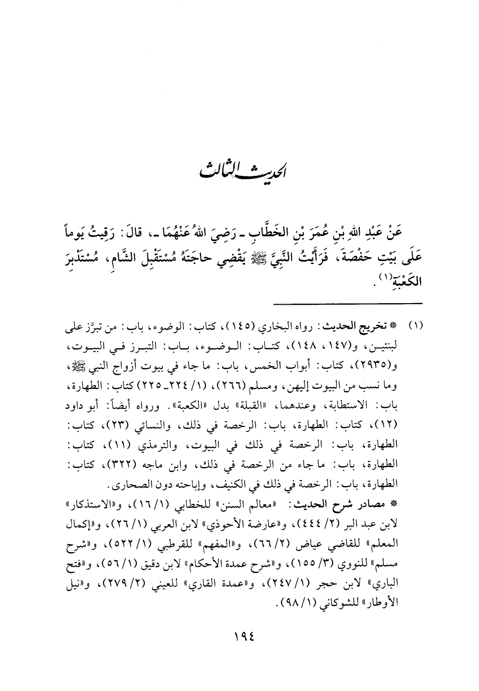 عَنْ عَبْدِ اللهِ بْنِ عُمَرَ بْنِ الخَطَّابِ - رَضِيَ اللهُ عَنْهُمَا -، قالَ: رَقِيتُ يَوماً عَلَى بَيْتِ حَفْصَةَ، فَرَأَيْتُ النَّبِيَّ - صلى الله عليه وسلم - يَقْضِي حاجَتَهُ مُسْتَقْبِلَ الشَّامِ، مُسْتَدْبِرَ الكَعْبَةِ (١).