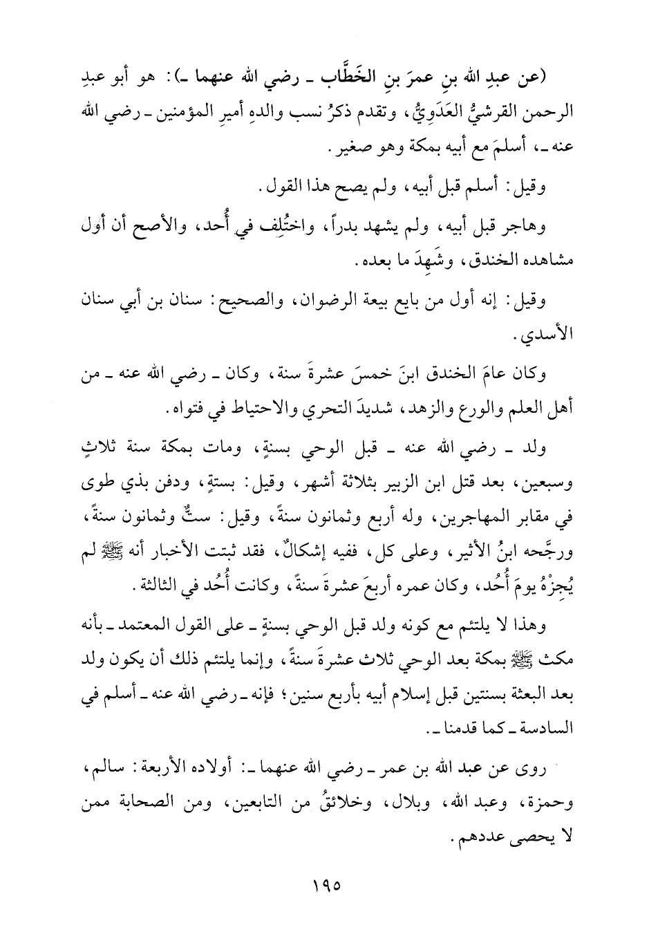 (عن عبدِ الله بنِ عمرَ بنِ الخَطَّاب - رضي الله عنهما -): هو أبو عبدِ الرحمن القرشيُّ العَدَوِيُّ، وتقدم ذكرُ نسب والدهِ أميرِ المؤمنين - رضي الله عنه-، أسلمَ مع أبيه بمكة وهو صغير.