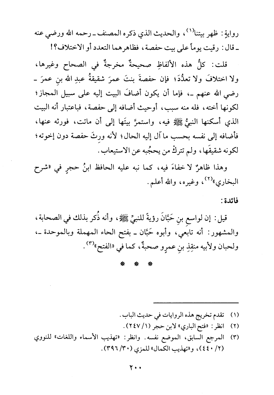 قلت: كلُّ هذه الألفاظِ صحيحةٌ مخرجةٌ في الصحاح وغيرها، ولا اختلافَ ولاتعدُّدَ؛ فإن حفصةَ بنتَ عمرَ شقيقةُ عبدِ الله بنِ عمرَ - رضي الله عنهم -، فإما أن يكون أضافَ البيت إليه على سبيل المجاز؛ لكونها أخته، فله منه سبب، أو حيث أضافه إلى حفصة، فباعتبار أنه البيت الذي أسكنها النبيُّ - صلى الله عليه وسلم - فيه، واستمرَّ بيتَها إلى أن ماتت، فورثه عنها، فأضافه إلى نفسه بحسب ما آل إليه الحال؛ لأنه ورِثَ حفصة دون إخوته؛ لكونه شقيقَها، ولم تتركْ من يحجُبه عن الاستيعاب.