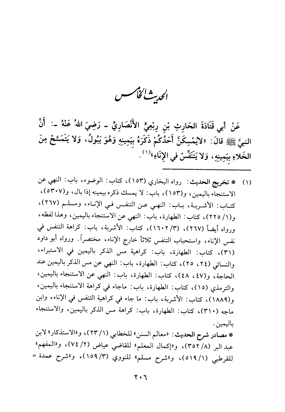 عَنْ أبي قَتَادَةَ الحَارِثِ بْنِ رِبْعِيٍّ الأَنْصَارِيِّ - رَضِيَ اللهُ عَنْهُ -: أَنَّ النبيَّ - صلى الله عليه وسلم - قالَ: "لا يُمْسِكَنَّ أَحَدُكُمْ ذَكَرَهُ بِيَمِينِهِ وَهُوَ يَبُولُ، وَلا يَتَمَسَّحْ مِنَ الخَلاءِ بِيَمِينِهِ، وَلايَتنفَّسْ في الإِنَاءِ" (١).