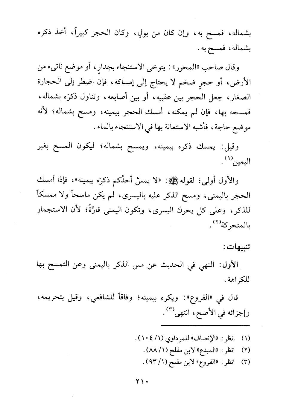 وقال صاحب "المحرر": يتوخى الاستنجاء بجدارٍ، أو موضع ناتىء من الأرض، أو حجرٍ ضخم لا يحتاج إلى إمساكه، فإن اضطر إلى الحجارة الصغار، جعل الحجر بين عقبيه، أو بين أصابعه، وتناول ذكرَه بشماله، فمسحه بها، فإن لم يمكنه، أمسك الحجر بيمينه، ومسح بشماله؛ لأنه موضع حاجة، فأشبه الاستعانة بها في الاستنجاء بالماء.