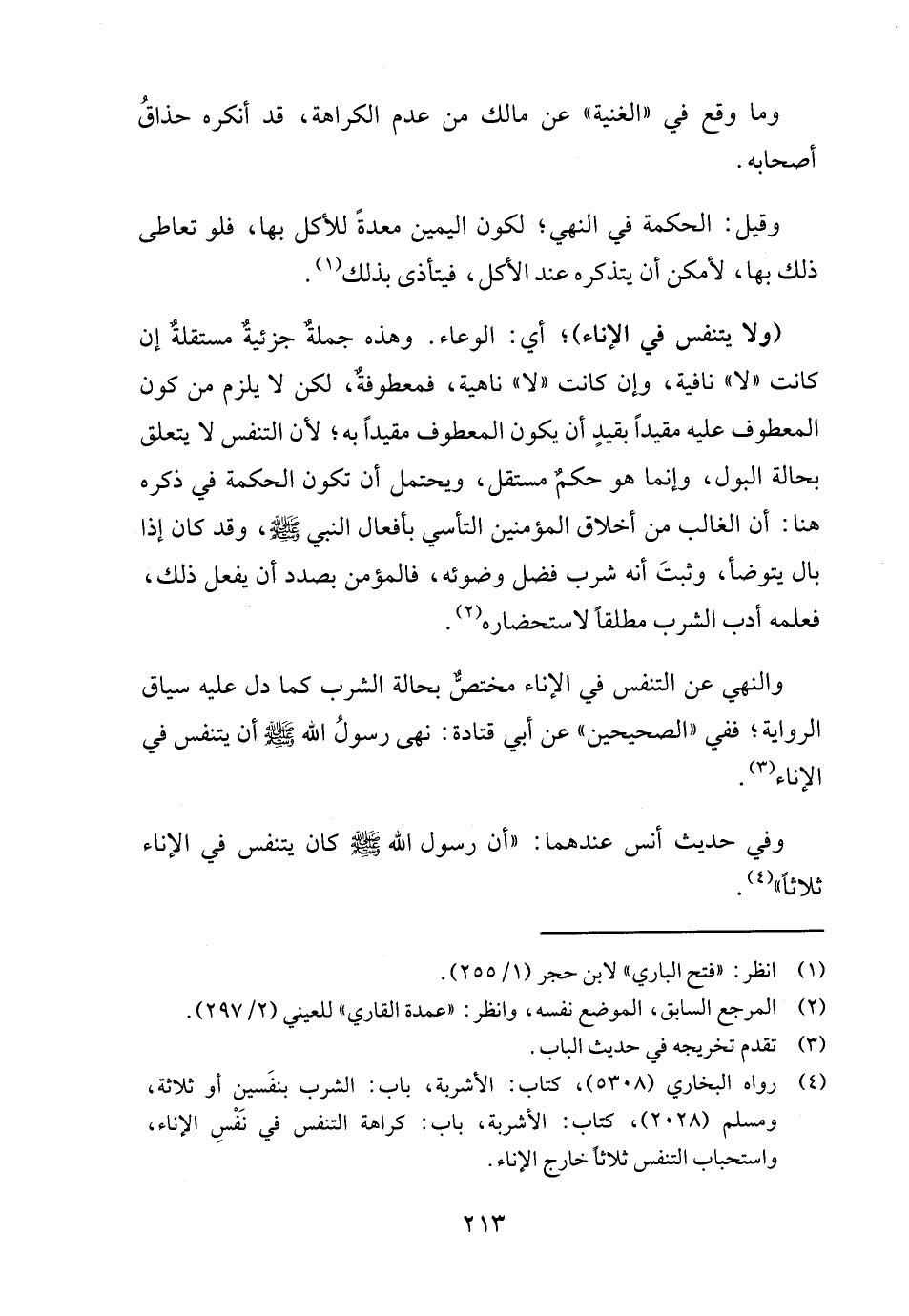 (٤) رواه البخاري (٥٣٠٨)، كتاب: الأشربة، باب: الشرب بنفَسين أو ثلاثة، ومسلم (٢٠٢٨)، كتاب: الأشربة، باب: كراهة التنفس في نَفْسِ الإناء، واستحباب التنفس ثلاثاً خارج الإناء.