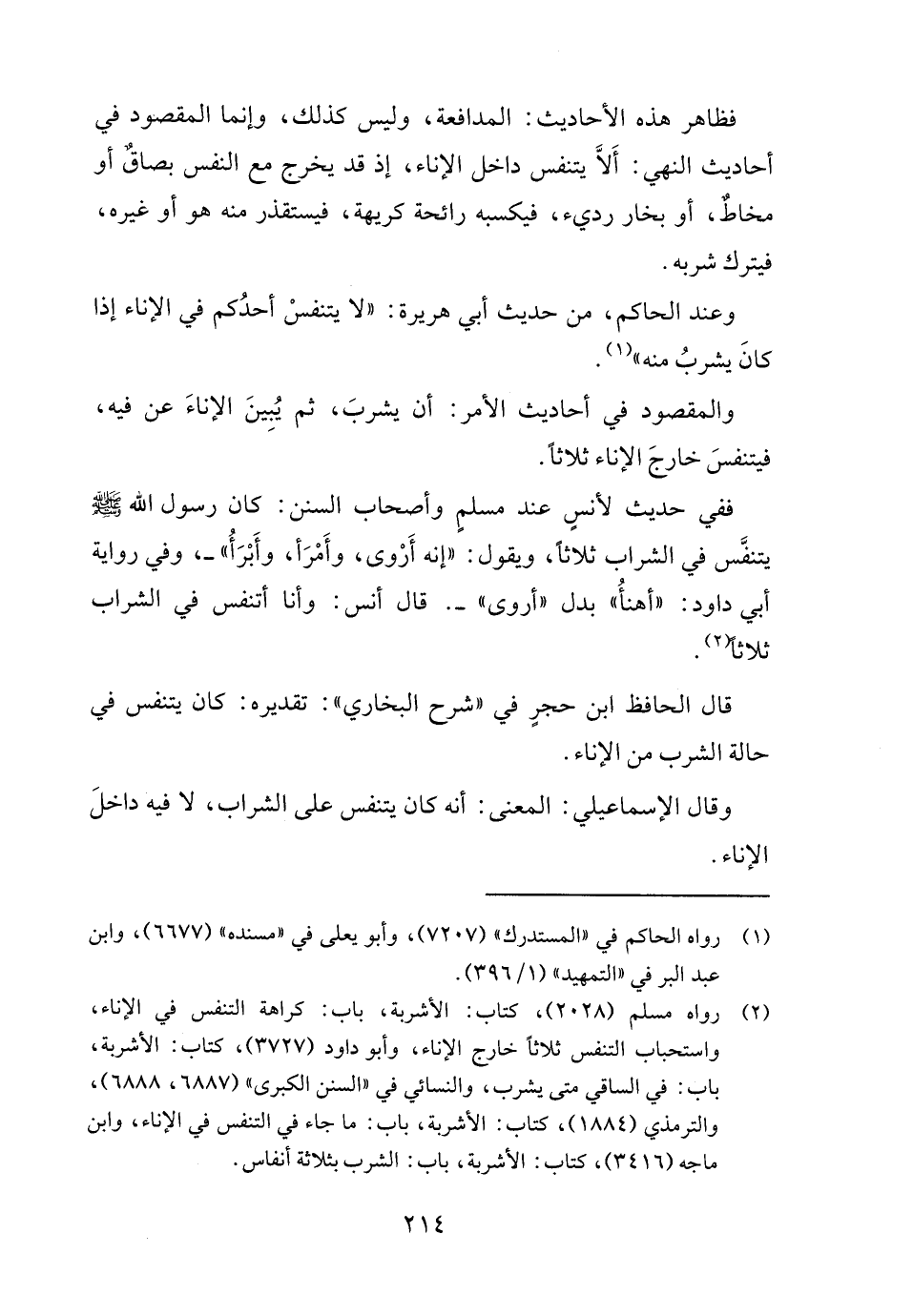 (٢) رواه مسلم (٢٠٢٨)، كتاب: الأشربة، باب: كراهة التنفس في الإناء، واستحباب التنفس ثلاثاً خارج الإناء، وأبو داود (٣٧٢٧)، كتاب: الأشربة، باب: في الساقي متى يشرب، والنسائي في "السنن الكبرى" (٦٨٨٧، ٦٨٨٨)، والترمذي (١٨٨٤)، كتاب: الأشربة، باب: ما جاء في التنفس في الإناء، وابن ماجه (٣٤١٦)، كتاب: الأشربة، باب: الشرب بثلاثة أنفاس.