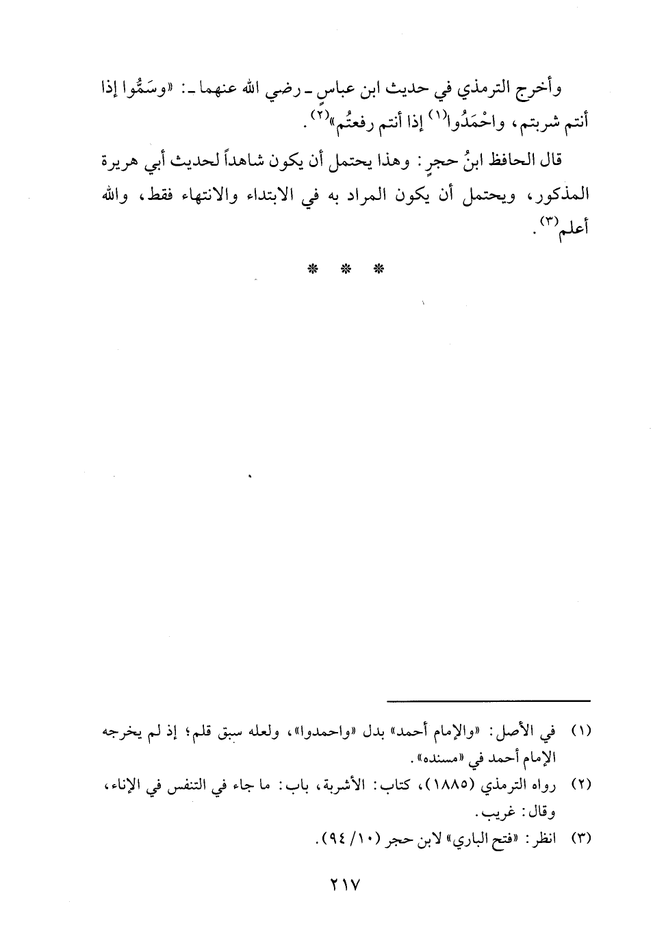 وأخرج الترمذي في حديث ابن عباسٍ - رضي الله عنهما -: "وسَمُّوا إذا أنتم شربتم، واحْمَدُوا (١) إذا أنتم رفعتُم" (٢).
