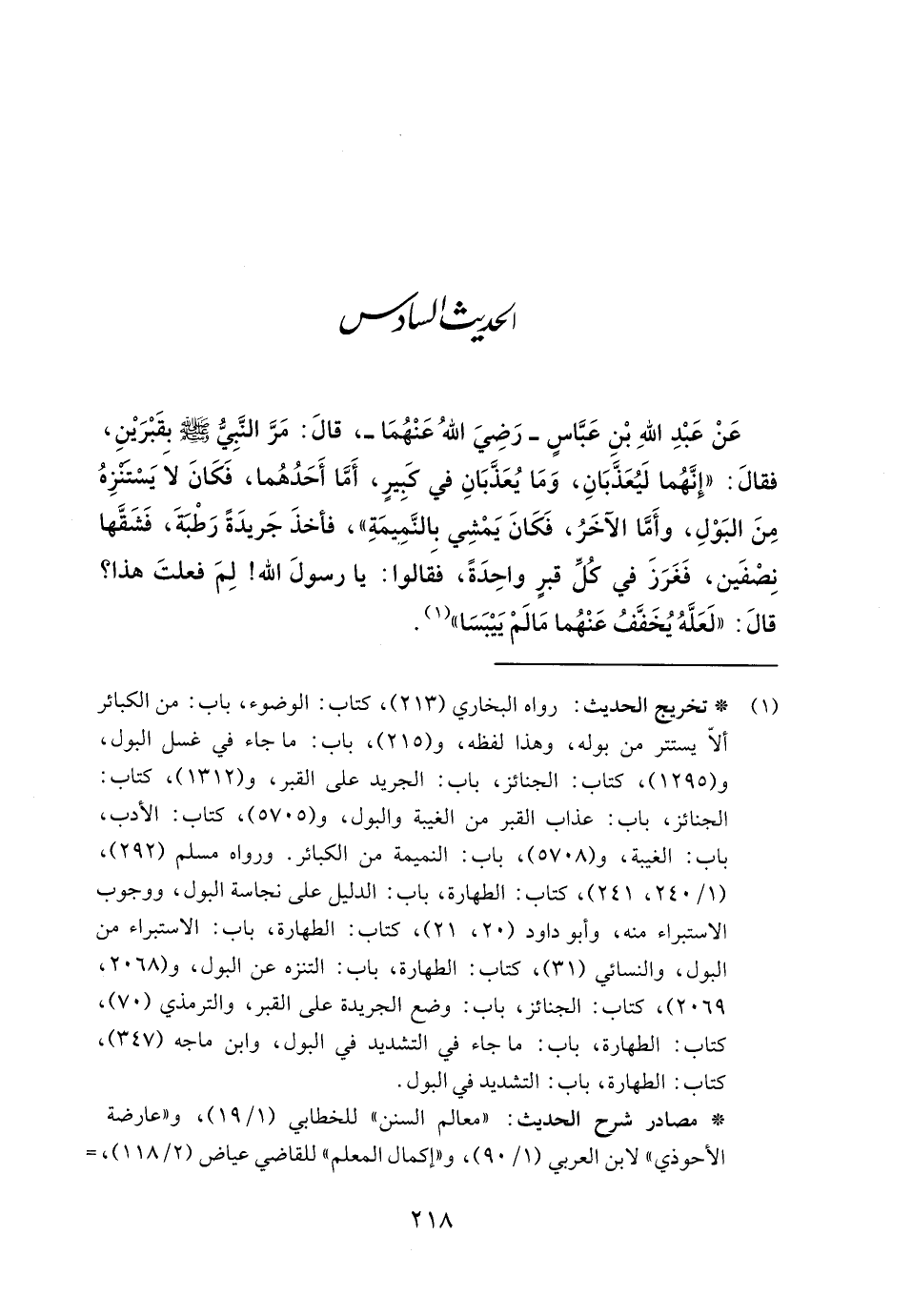 عَنْ عَبْدِ اللهِ بْنِ عَبَّاسٍ - رَضِيَ اللهُ عَنْهمَا-، قالَ: مَرَّ النَّبِيُّ - صلى الله عليه وسلم - بقَبْرَيْنِ، فقالَ: "إِنَّهُما لَيُعَذَّبَانِ، وَمَا يُعَذبَانِ في كبِيرٍ، أَمَّا أَحَدُهُما، فَكَانَ لاَ يَسْتَنْزِهُ مِنَ البَوْلِ، وأَمَّا الآخَرُ، فَكَانَ يَمْشِي بالنَّميمَةِ"، فأخذَ جَريدَةً رَطْبَةَ، فَشَقَّها نِصْفَين، فَغَرَزَ في كُلِّ قبرٍ واحِدَةً، فَقالوا: يا رسولَ الله! لِمَ فعلتَ هذا؟ قالَ: "لَعَلَّهُ يُخَفَّفُ عَنْهُما مَالَمْ يَيْبَسَا" (١).