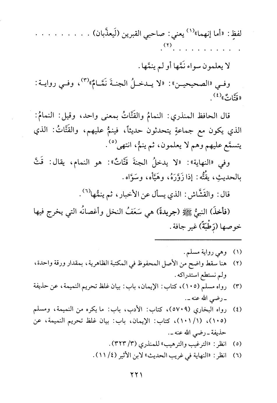 (٣) رواه مسلم (١٠٥)، كتاب: الإيمان، باب: بيان غلظ تحريم النميمة، عن حذيفة - رضي الله عنه -.