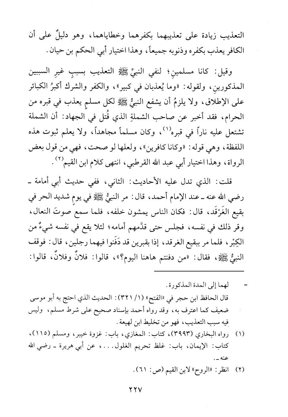 وقيل: كانا مسلمينِ؛ لنفي النبيِّ - صلى الله عليه وسلم - التعذيب بسببٍ غيرِ السببين المذكورينِ، ولقوله: "وما يُعذبان في كبير"، والكفر والشرك أكبرُ الكبائر على الإطلاق، ولا يلزمُ أن يشفع النبيُّ - صلى الله عليه وسلم - لكل مسلمٍ يعذب في قبره من الحرام، فقد أخبر عن صاحب الشملةِ الذي قُتل في الجهاد: أن الشملة تشتعل عليه ناراً في قبره (١)، وكان مسلماً مجاهداً، ولا يعلم ثبوت هذه اللفظة، وهي قوله: "وكانا كافرين"، ولعلها لو صحت، فهي من قول بعض الرواة، وهذا اختيار أبي عبد الله القرطبي، انتهى كلام ابن القيم (٢).