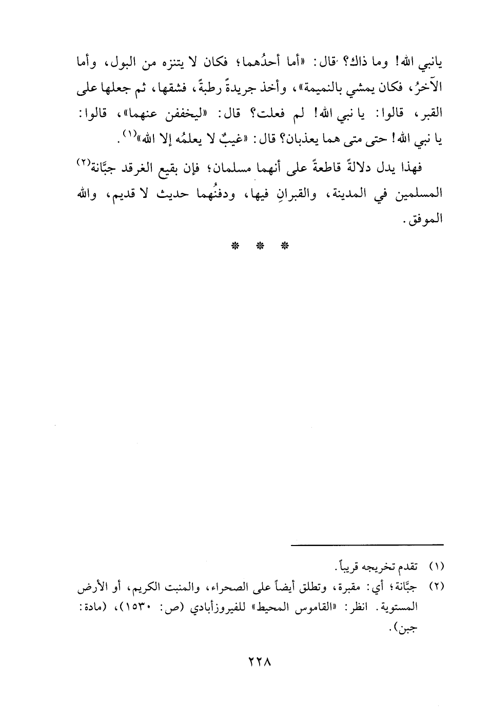 يانبي الله! وما ذاك؟ قال: "أما أحدُهما؛ فكان لا يتنزه من البول، وأما الآخرُ، فكان يمشي بالنميمة"، وأخذ جريدةً رطبة، فشقها، ثم جعلها على القبر، قالوا: يا نبي الله! لم فعلت؟ قال: "ليخففن عنهما"، قالوا: يا نبي الله! حتى متى هما يعذبان؟ قال: "غيبٌ لا يعلمُه إلا الله" (١).