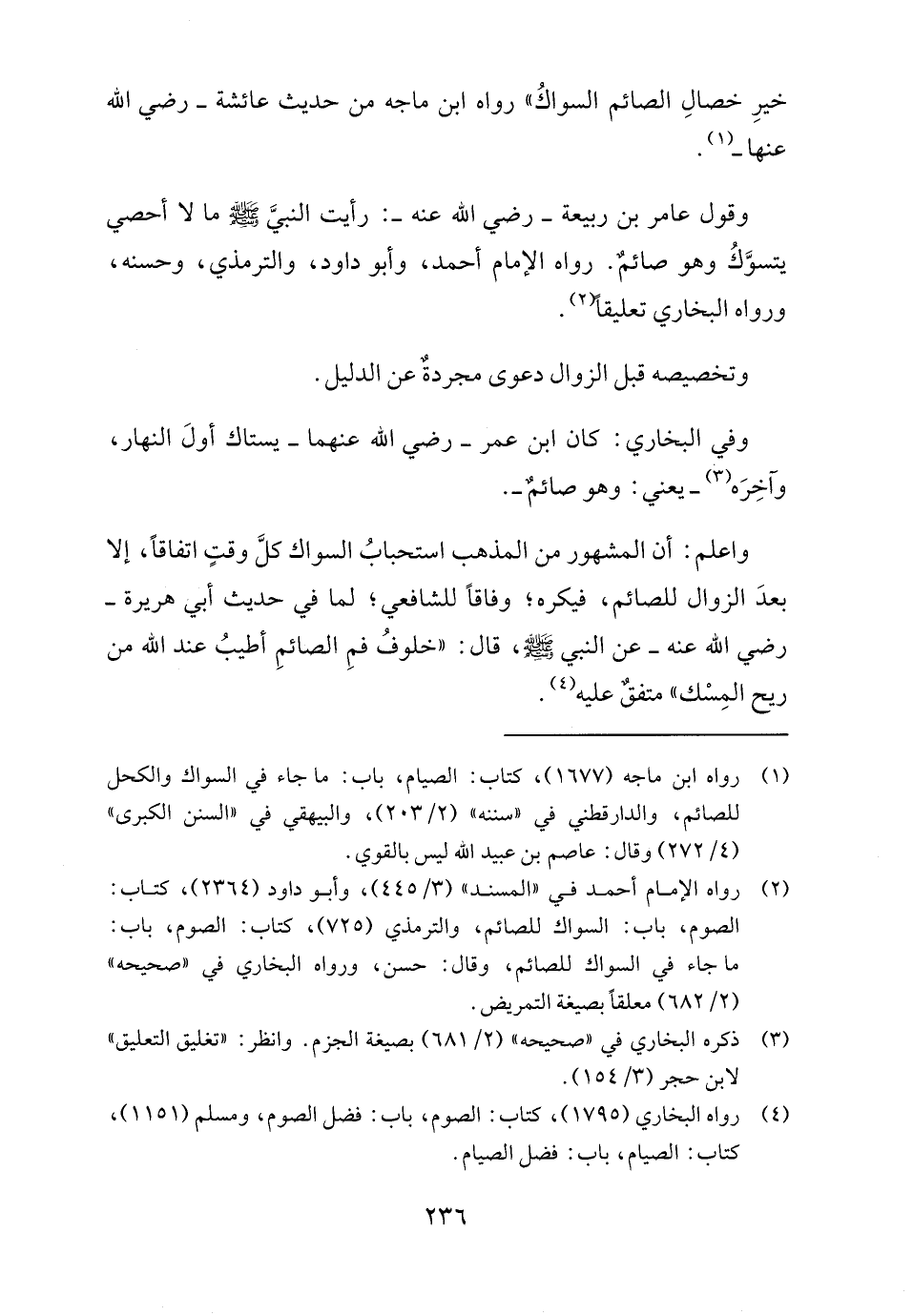 وقول عامر بن ربيعة - رضي الله عنه -: رأيت النبيَّ - صلى الله عليه وسلم - ما لا أحصي يتسوَّكُ وهو صائمٌ. رواه الإمام أحمد، وأبو داود، والترمذي، وحسنه، ورواه البخاري تعليقاً (٢).