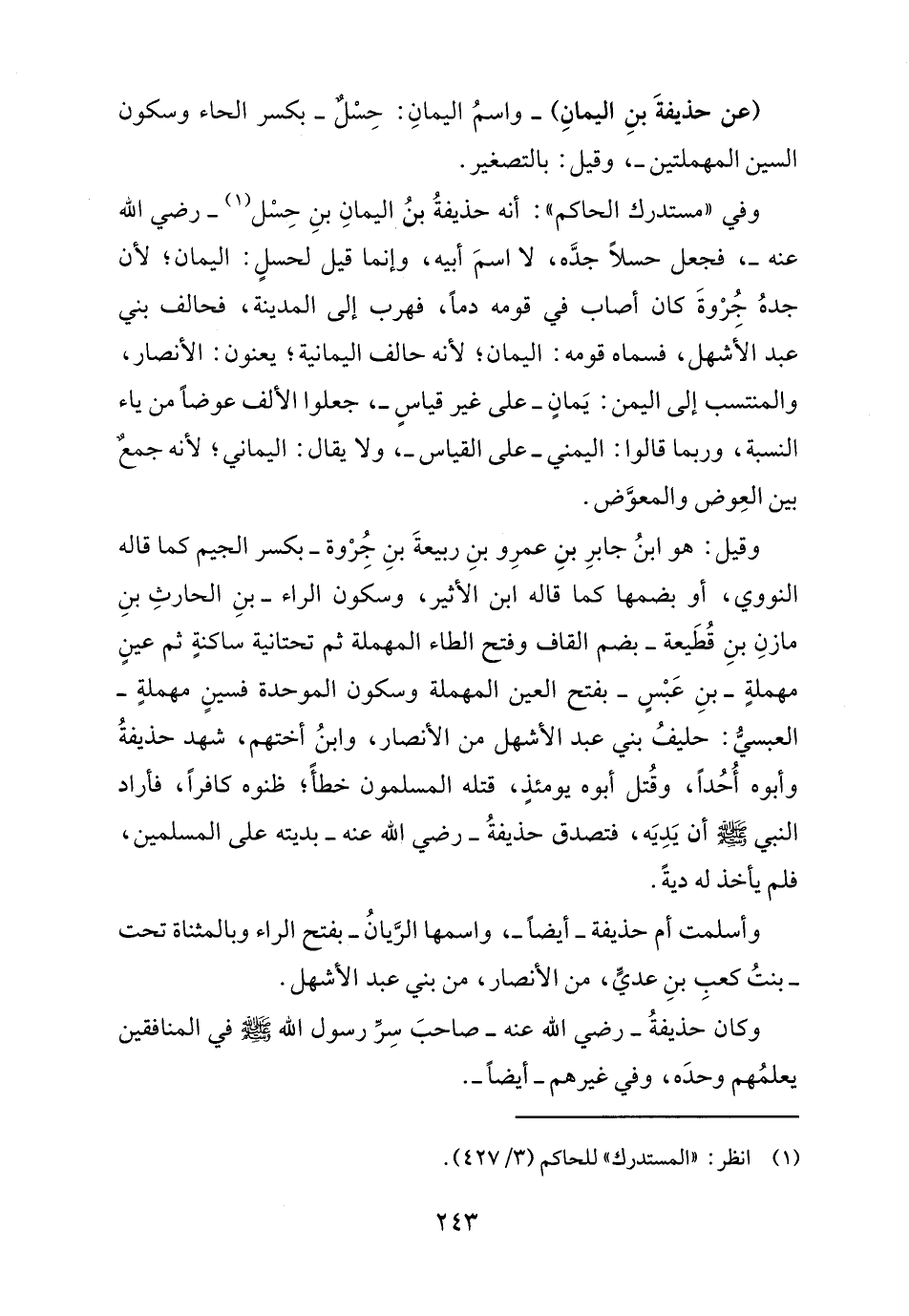 وقيل: هو ابنُ جابرِ بنِ عمرِو بنِ ربيعةَ بنِ جُرْوة -بكسر الجيم كما قاله النووي، أو بضمها كما قاله ابن الأثير، وسكون الراء- بنِ الحارت بنِ مازنِ بنِ قُطَيعة -بضم القاف وفتح الطاء المهملة ثم تحتانية ساكنةٍ ثم عينٍ مهملةٍ- بنِ عَبْسٍ -بفتح العين المهملة وسكون الموحدة فسينٍ مهملةٍ- العبسيُّ: حليفُ بني عبد الأشهل من الأنصار، وابنُ أختهم، شهد حذيفةُ وأبوه أُحُداً، وقُتل أبوه يومئذٍ، قتله المسلمون خطأً؛ ظنوه كافراً، فأراد النبي - صلى الله عليه وسلم - أن يَدِيَه، فتصدق حذيفةُ - رضي الله عنه - بديته على المسلمين، فلم يأخذ له ديةً.