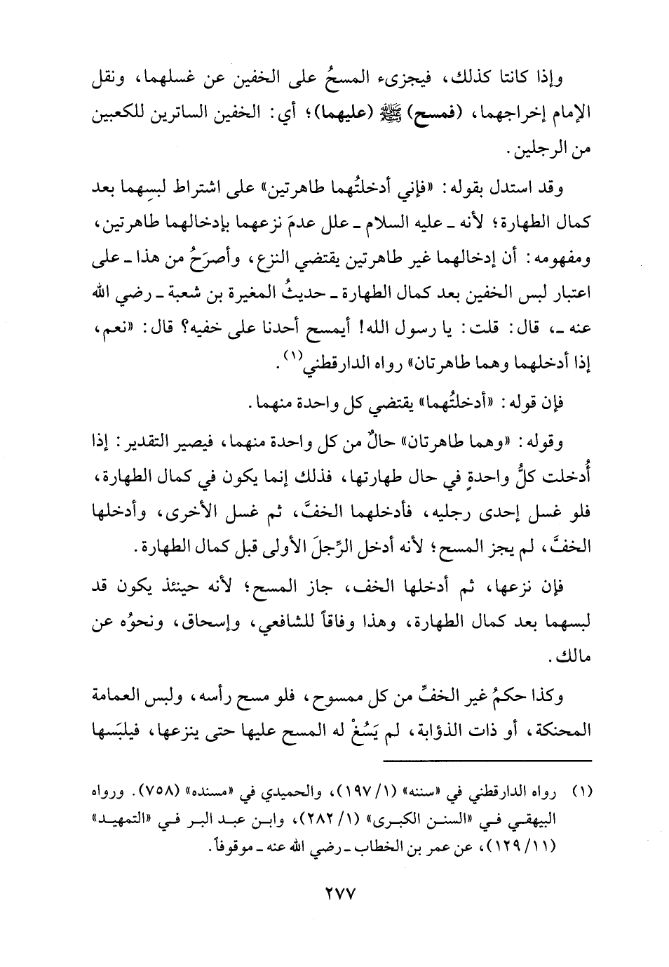 وقد استدل بقوله: "فإني أدخلتُهما طاهرتين" على اشتراط لبسِهما بعد كمال الطهارة؛ لأنه - عليه السلام - علل عدمَ نزعهما بإدخالهما طاهرتين، ومفهومه: أن إدخالهما غير طاهرتين يقتضي النزع، وأصرَحُ من هذا - على اعتبار لبس الخفين بعد كمال الطهارة - حديثُ المغيرة بن شعبة - رضي الله عنه -، قال: قلت: يا رسول الله! أيمسح أحدنا على خفيه؟ قال: "نعم، إذا أدخلهما وهما طاهرتان" رواه الدارقطني (١).