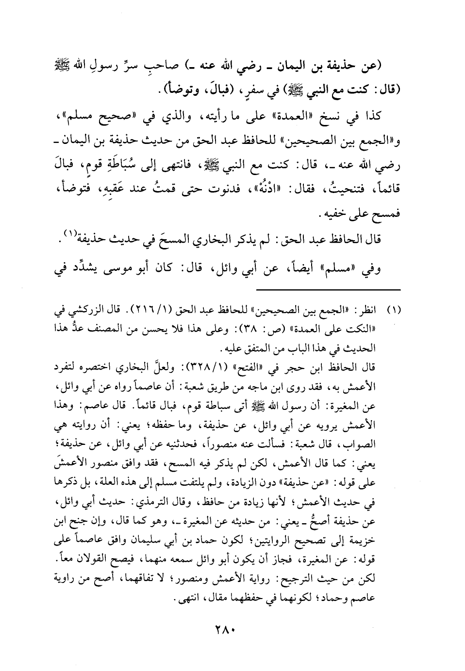 كذا في نسخ "العمدة" على مارأيته، والذي في "صحيح مسلم"، و"الجمع بين الصحيحين" للحافظ عبد الحق من حديث حذيفة بن اليمان - رضي الله عنه -، قال: كنت مع النبي - صلى الله عليه وسلم -، فانتهى إلى سُبَاطَةِ قومٍ، فبالَ قائماً، فتنحيتُ، فقال: "ادْنُهْ"، فدنوت حتى قمتُ عند عَقبِهِ، فتوضأ، فمسح على خفيه.