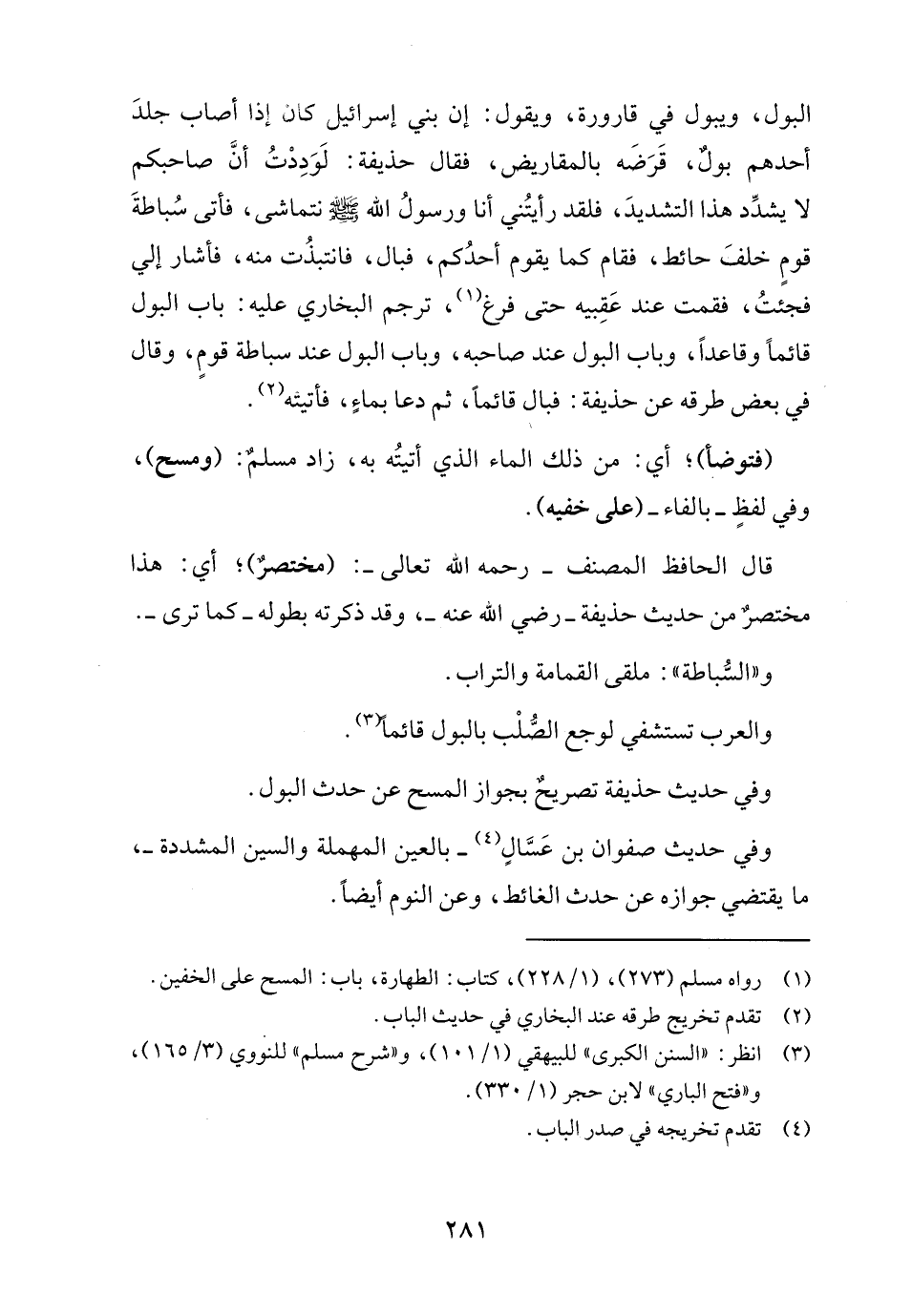 البول، ويبول في قارورة، ويقول: إن بني إسرائيل كان إذا أصاب جلدَ أحدهم بولٌ، قَرَضَه بالمقاريض، فقال حذيفة: لَوَدِدْتُ أن صاحبكم لا يشدِّد هذا التشديدَ، فلقد رأيتُني أنا ورسولُ الله - صلى الله عليه وسلم - نتماشى، فأتى سُباطةَ قومٍ خلفَ حائط، فقام كما يقوم أحدُكم، فبال، فانتبذُت منه، فأشار إلي فجئتُ، فقمت عند عَقِبيه حتى فرغ (١)، ترجم البخاري عليه: باب البول قائماً وقاعداً، وباب البول عند صاحبه، وباب البول عند سباطة قومٍ، وقال في بعض طرقه عن حذيفة: فبال قائماً، ثم دعا بماءٍ، فأتيته (٢).