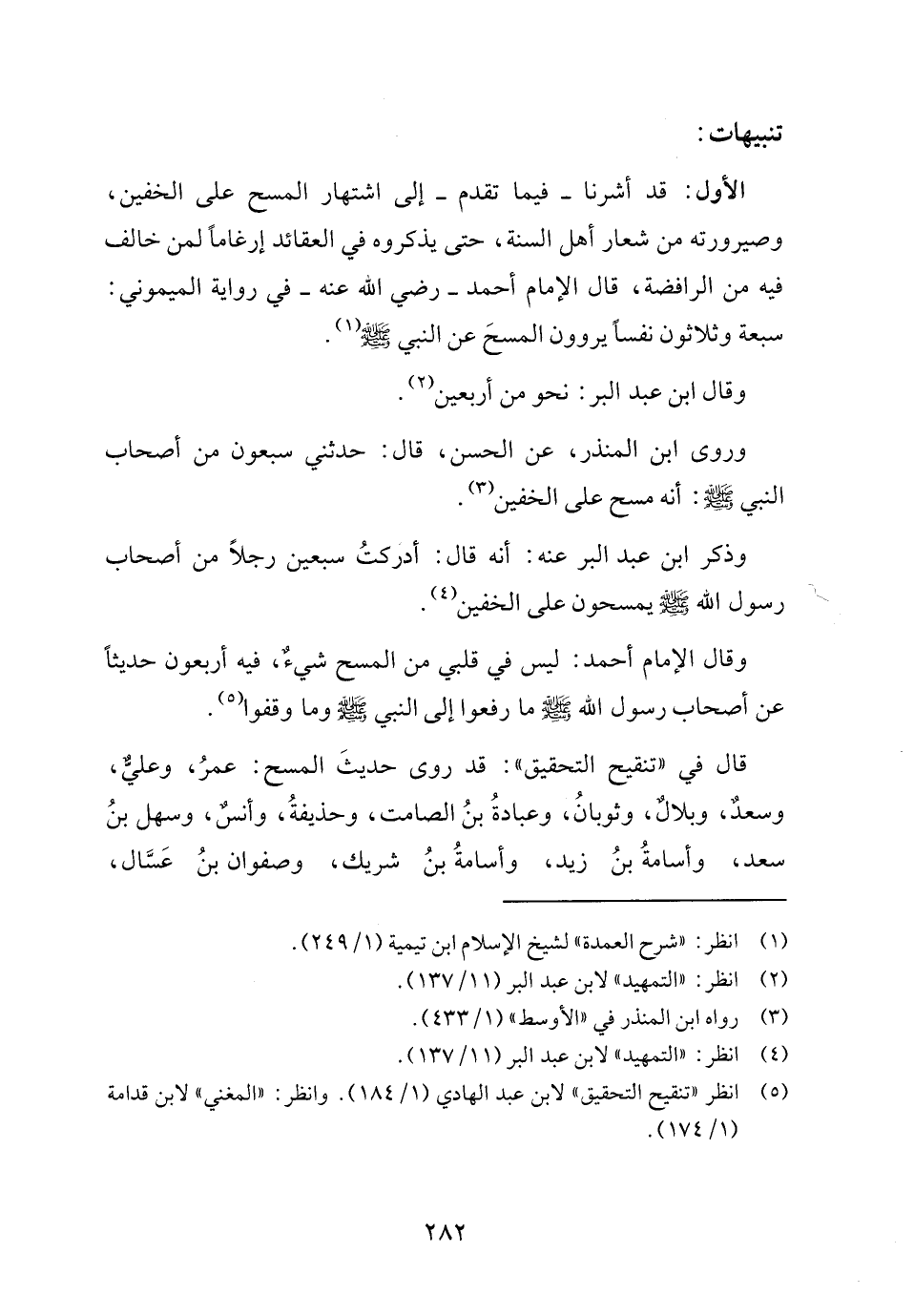 قال في "تنقيح التحقيق": قد روى حديثَ المسح: عمرُ، وعليٌّ، وسعدٌ، وبلالٌ، وثوبانُ، وعبادةُ بنُ الصامت، وحذيفةُ، وأنسٌ، وسهل بنُ سعد، وأسامةُ بنُ زيد، وأسامةُ بنُ شريك، وصفوان بنُ عَسَّال،