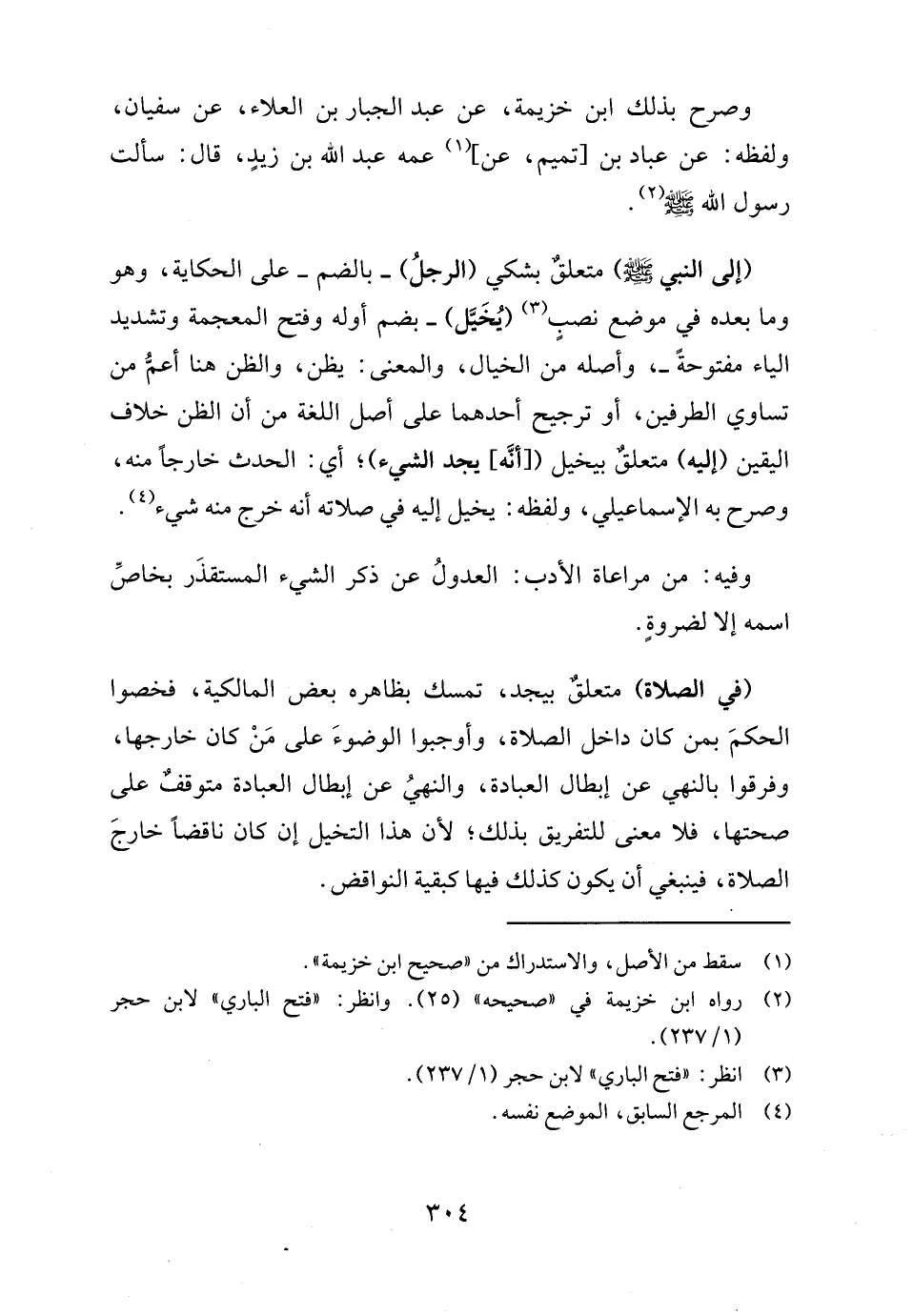 (إلى النبي - صلى الله عليه وسلم -) متعلقٌ بشكي (الرجلُ) -بالضم- على الحكاية، وهو وما بعده في موضع نصبٍ (٣) (يُخَيَّل) -بضم أوله وفتح المعجمة وتشديد الياء مفتوحةً-، وأصله من الخيال، والمعنى: يظن، والظن هنا أعمُّ من تساوي الطرفين، أو ترجيح أحدهما على أصل اللغة من أن الظن خلاف اليقين (إليه) متعلقٌ بيخيل ([أنَّه] يجد الشيء)؛ أي: الحدث خارجاً منه، وصرح به الإسماعيلي، ولفظه: يخيل إليه في صلاته أنه خرج منه شيء (٤).