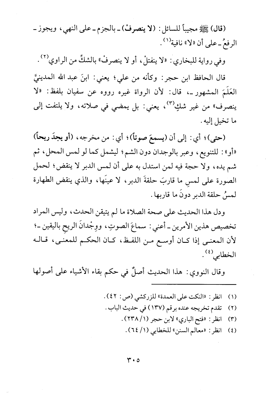 ودل هذا الحديث على صحة الصلاة ما لم يتيقن الحدث، وليس المراد تخصيص هذين الأمرين - أعني: سماعَ الصوتِ، ووِجْدانَ الريحِ باليقين -؛ لأن المعنى إذا كان أوسع من اللفظ، كان الحكم للمعنى، قاله الخطابي (٤).
