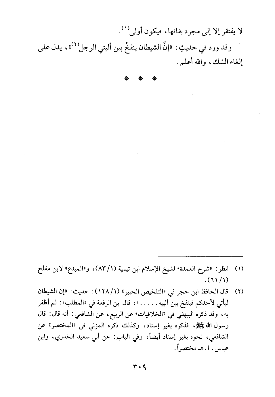 (٢) قال الحافظ ابن حجر في "التلخيص الحبير" (١/ ١٢٨): حديث: "إن الشيطان ليأتي لأحدكم فينفخ بين ألييه ..... "، قال ابن الرفعة في "المطلب": لم أظفر به، وقد ذكره البيهقي في "الخلافيات" عن الربيع، عن الشافعي: أنه قال: قال رسول الله - صلى الله عليه وسلم -، فذكره بغير إسناد، وكذلك ذكره المزني في "المختصر" عن الشافعي، نحوه بغير إسناد أيضاً، وفي الباب: عن أبي سعيد الخدري، وابن عباس. ا. هـ مختصراً.