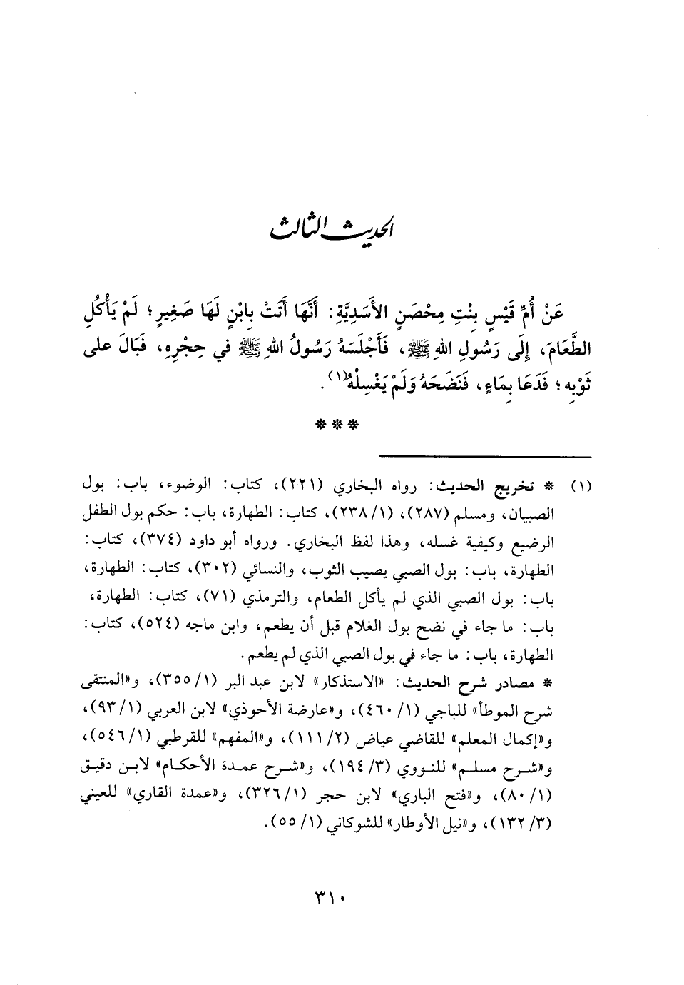 عَنْ أُمِّ قَيْسٍ بِنْتِ مِحْصَنٍ الأَسَدِيَّةِ: أَنَّهَا أَتَتْ بابْنٍ لَهَا صَغِيرٍ؛ لَمْ يَأْكُلِ الطَّعَامَ، إِلَى رَسُولِ اللهِ - صلى الله عليه وسلم -، فَأَجْلَسَهُ رَسُولُ اللهِ - صلى الله عليه وسلم - في حِجْرِهِ، فَبَالَ على ثَوْبِه، فَدَعَا بِمَاءٍ، فَنَضَحَهُ وَلَمْ يَغْسِلْهُ (١).