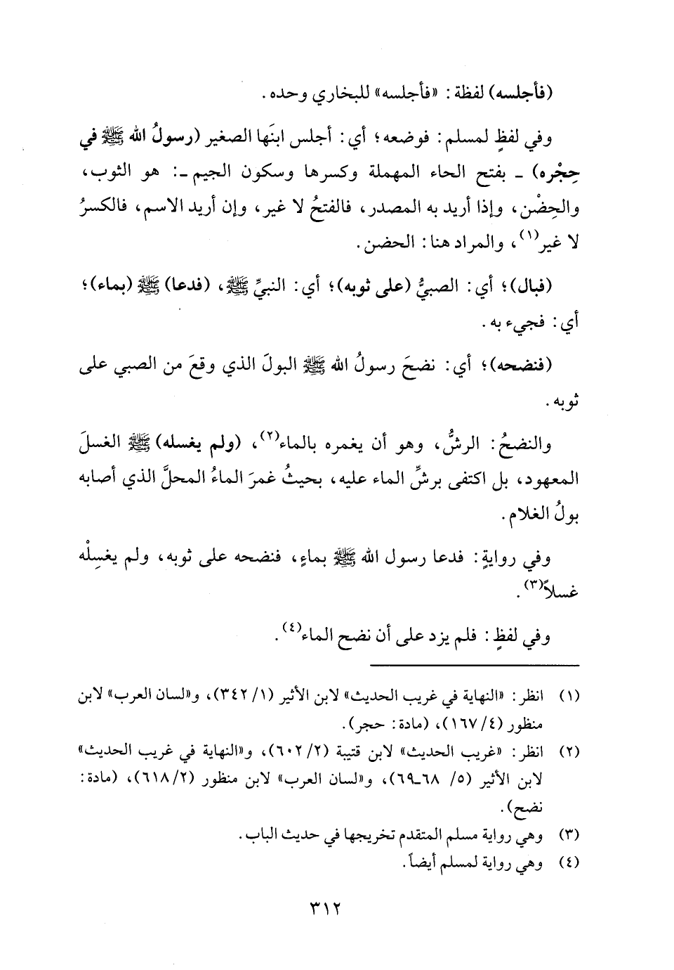 (فنضحه)؛ أي: نضحَ رسولُ الله - صلى الله عليه وسلم - البولَ الذي وقعَ من الصبي على ثوبه.