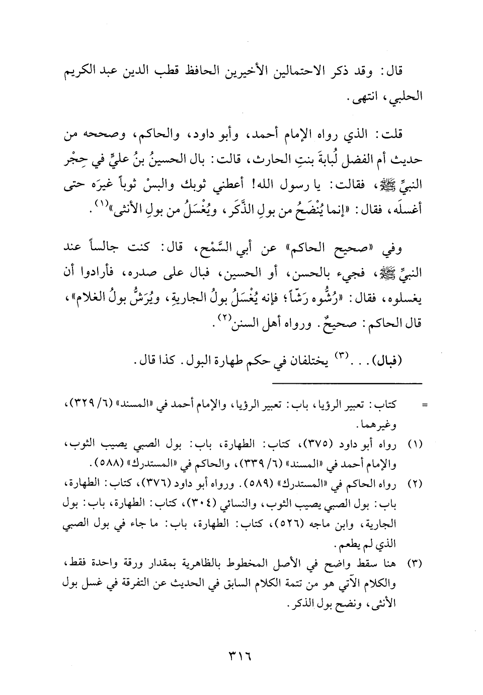 قلت: الذي رواه الإمام أحمد، وأبو داود، والحاكم، وصححه من حديث أم الفضل لُبابةَ بنتِ الحارث، قالت: بال الحسينُ بنُ عليٍّ في حِجْر النبيِّ - صلى الله عليه وسلم -، فقالت: يا رسول الله! أعطني ثوبك والبسْ ثوباً غيرَه حتى أغسلَه، فقال: "إنما يُنْضَحُ من بولِ الذَّكَر، ويُغْسَلُ من بولِ الأنثى" (١).