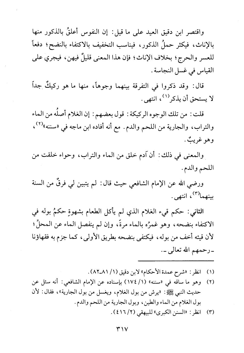 (٢) وهو ما ساقه في "سننه" (١/ ١٧٤) بإسناده عن الإمام الشافعي: أنه سئل عن حديث النبي - صلى الله عليه وسلم -: "يرش من بول الغلام، ويغسل من بول الجارية"، فقال: لأن بول الغلام من الماء والطين، وبول الجارية من اللحم والدم.