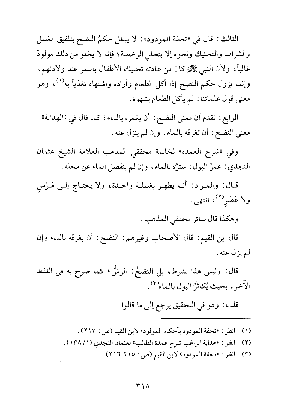 الثالث: قال في "تحفة المودود": لا يبطل حكمُ النضح بتلفيق الغسل والشراب والتحنيك ونحوه إلا بتعطلِ الرخصة؛ فإنه لا يخلو من ذلك مولودٌ غالباً، ولأن النبي - صلى الله عليه وسلم - كان من عادته تحنيك الأطفال بالتمر عند ولادتهم، وإنما يزول حكم النضح إذا أكل الطعام وأراده واشتهاه تغذياً به (١)، وهو معنى قول علمائنا: لم يأكل الطعام بشهوة.