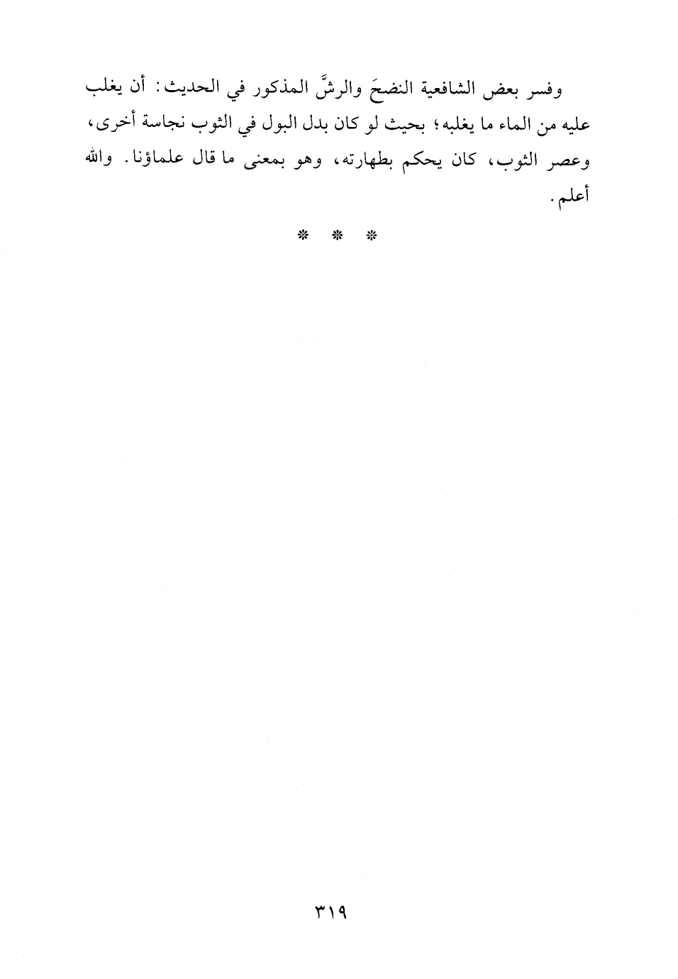 وفسر بعض الشافعية النضحَ والرشَّ المذكور في الحديث: أن يغلب عليه من الماء ما يغلبه؛ بحيث لو كان بدل البول في الثوب نجاسة أخرى، وعصر الثوب، كان يحكم بطهارته، وهو بمعنى ما قال علماؤنا. والله أعلم.