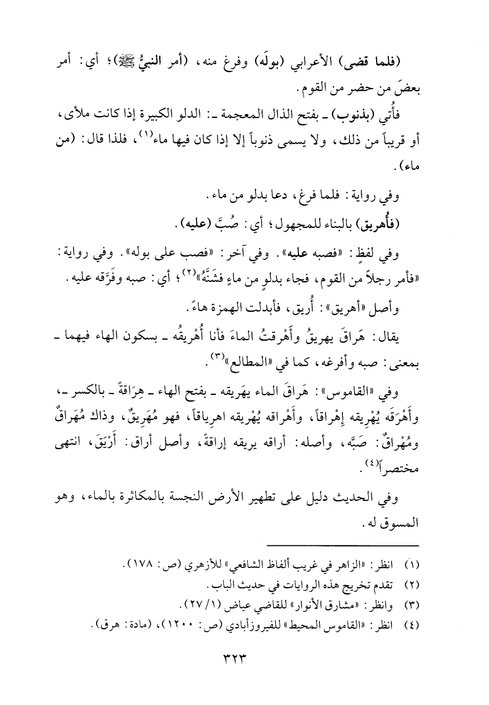 وفي لفظٍ: "فصبه عليه". وفي آخر: "فصب على بوله". وفي رواية: "فأمر رجلاً من القوم، فجاء بدلوٍ من ماءٍ فشَنَّهُ" (٢)؛ أي: صبه وفَرَّقه عليه. وأصل "أهريق": أُريق، فأبدلت الهمزة هاءً.