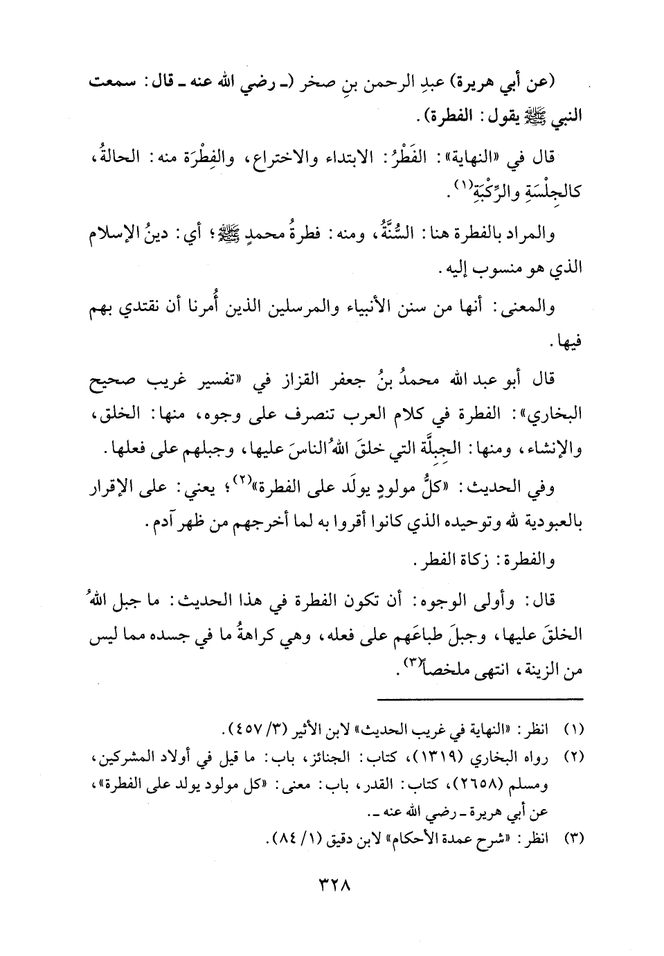 قال أبو عبد الله محمدُ بنُ جعفر القزاز في "تفسير غريب صحيح البخاري": الفطرة في كلام العرب تنصرف على وجوه، منها: الخلق، والإنشاء، ومنها: الجِبِلَّة التي خلقَ اللهُ الناسَ عليها، وجبلهم على فعلها.