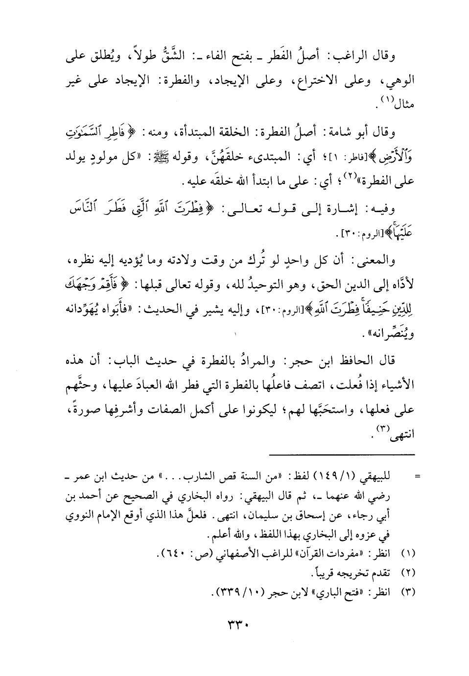 وقال أبو شامة: أصلُ الفطرة: الخلقة المبتدأة، ومنه: {فَاطِرِ السَّمَاوَاتِ وَالْأَرْضِ} [فاطر: ١]، أي: المبتدىء خلقَهُنَّ، وقوله - صلى الله عليه وسلم -: "كل مولودٍ يولد على الفطرة" (٢)، أي: على ما ابتدأ الله خلقَه عليه.