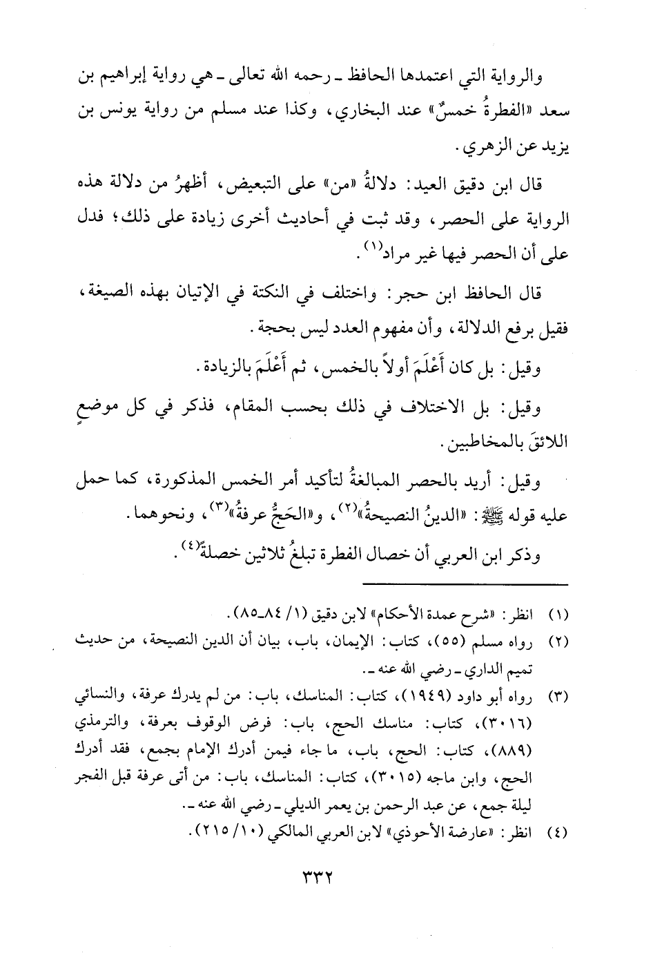 قال ابن دقيق العيد: دلالةُ "من" على التبعيض، أظهرُ من دلالة هذه الرواية على الحصر، وقد ثبت في أحاديث أخرى زيادة على ذلك؛ فدل على أن الحصر فيها غير مراد (١).