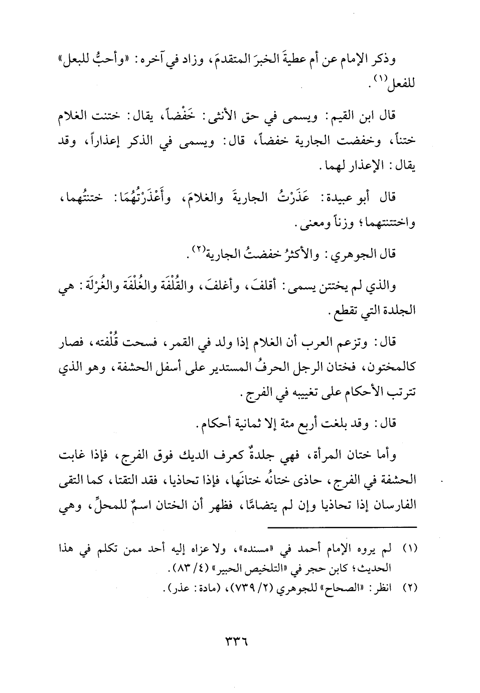 قال: وتزعم العرب أن الغلام إذا ولد في القمر، فسحت قُلْفته، فصار كالمختون، فختان الرجل الحرفُ المستدير على أسفل الحشفة، وهو الذي تترتب الأحكام على تغييبه في الفرج.
