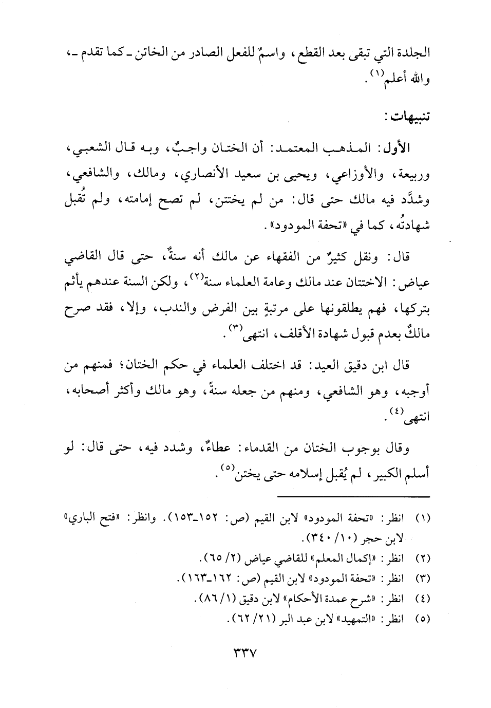 قال: ونقل كثيرٌ من الفقهاء عن مالك أنه سنةٌ، حتى قال القاضي عياض: الاختتان عند مالك وعامة العلماء سنة (٢)، ولكن السنة عندهم يأثم بتركها، فهم يطلقونها على مرتبةٍ بين الفرض والندب، وإلا، فقد صرح مالكٌ بعدم قبول شهادة الأقلف، انتهى (٣).
