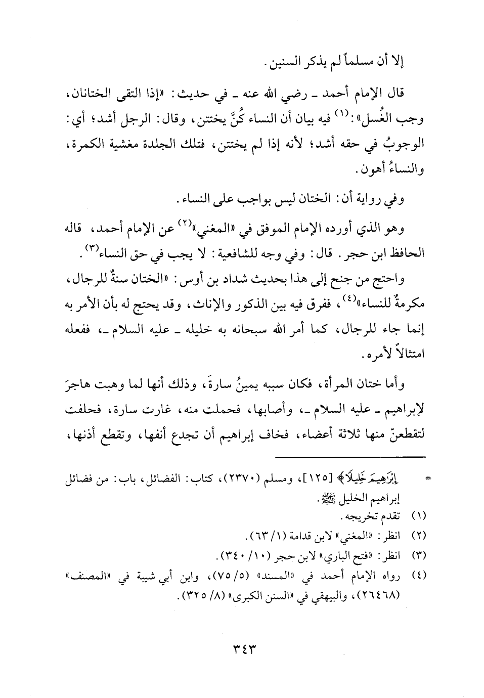 قال الإمام أحمد - رضي الله عنه - في حديث: "إذا التقى الختانان، وجب الغُسل": (١) فيه بيان أن النساء كُنَّ يختتن، وقال: الرجل أشد؛ أي: الوجوبُ في حقه أشد؛ لأنه إذا لم يختتن، فتلك الجلدة مغشية الكمرة، والنساءُ أهون.