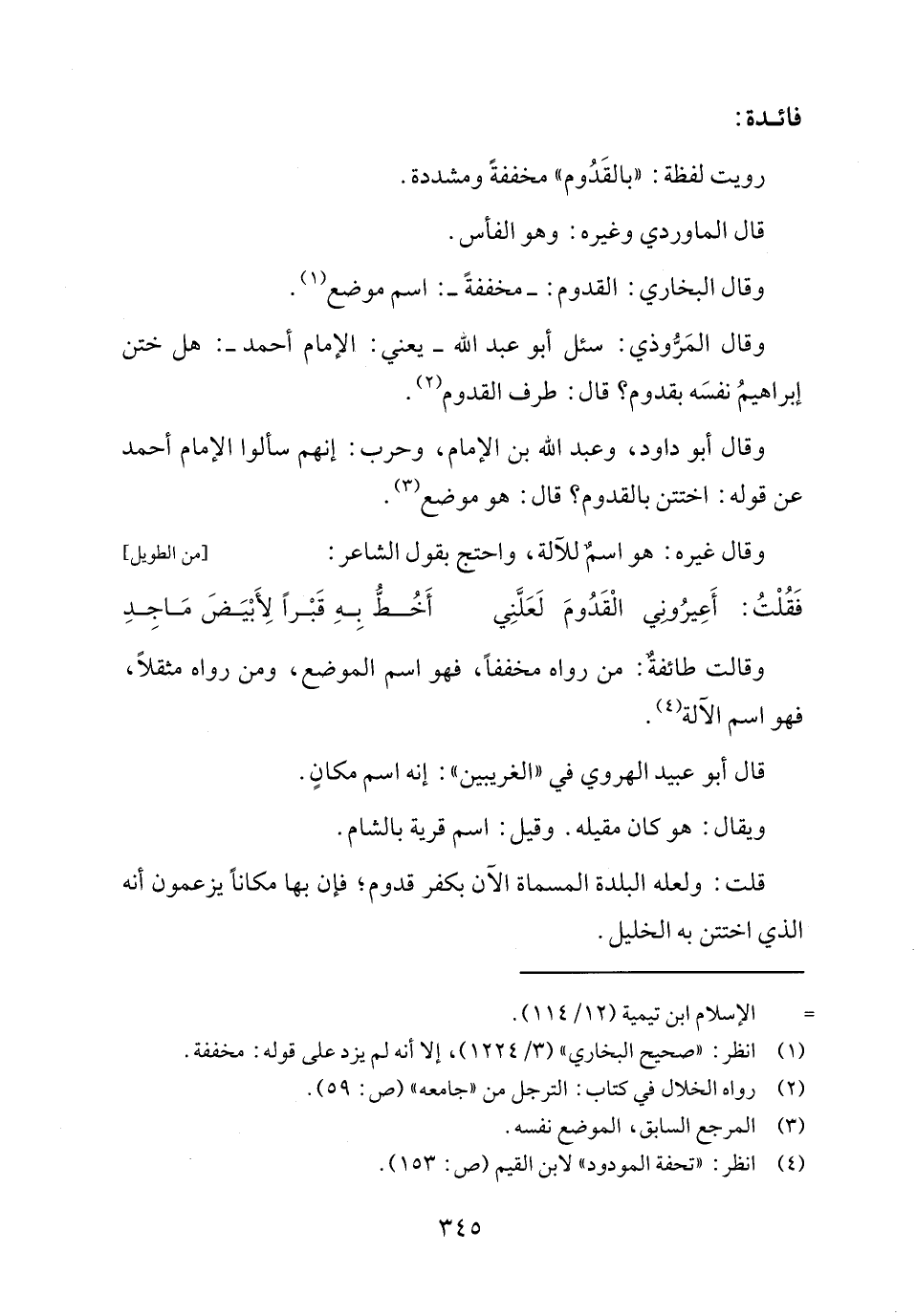 وقال أبو داود، وعبد الله بن الإمام، وحرب: إنهم سألوا الإمام أحمد عن قوله: اختتن بالقدوم؟ قال: هو موضع (٣).