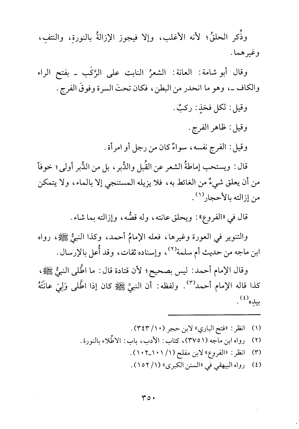 والتنوير في العورة وغيرها، فعله الإمامُ أحمد، وكذا النبيُّ - صلى الله عليه وسلم -، رواه ابن ماجه من حديث أم سلمة (٢)، وإسناده ثقات، وقد أُعل بالإرسال.
