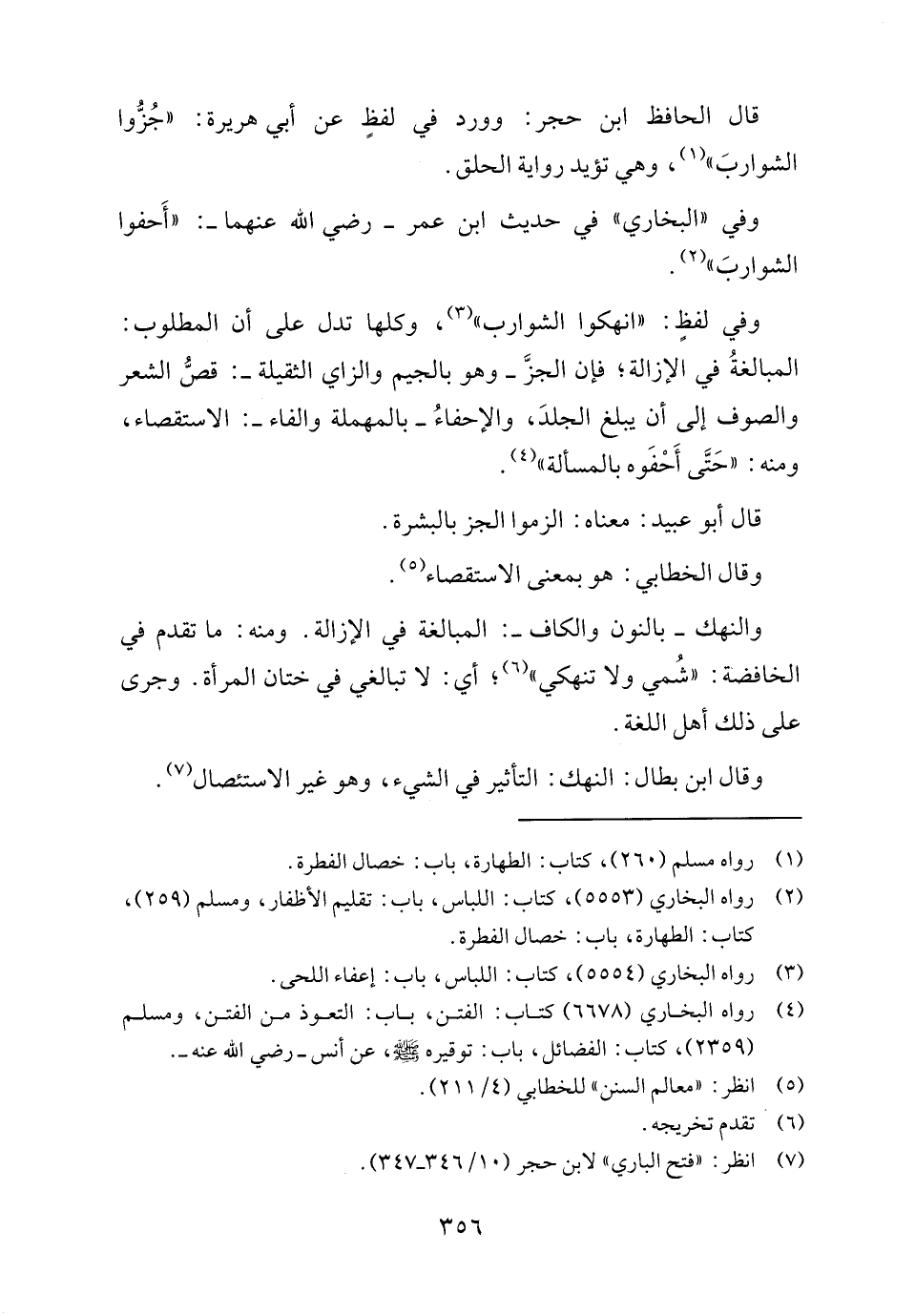 قال الحافظ ابن حجر: وورد في لفظٍ عن أبي هريرة: "جُزُّوا الشواربَ" (١)، وهي تؤيد رواية الحلق.