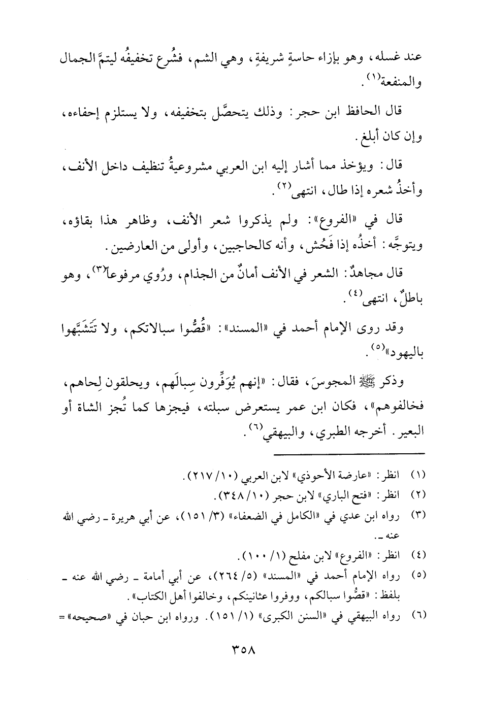 وذكر - صلى الله عليه وسلم - المجوسَ، فقال: "إنهم يُوَفِّرون سِبالَهم، ويحلقون لِحاهم، فخالفوهم"، فكان ابن عمر يستعرض سبلته، فيجزها كما تُجز الشاة أو البعير. أخرجه الطبري، والبيهقي (٦).