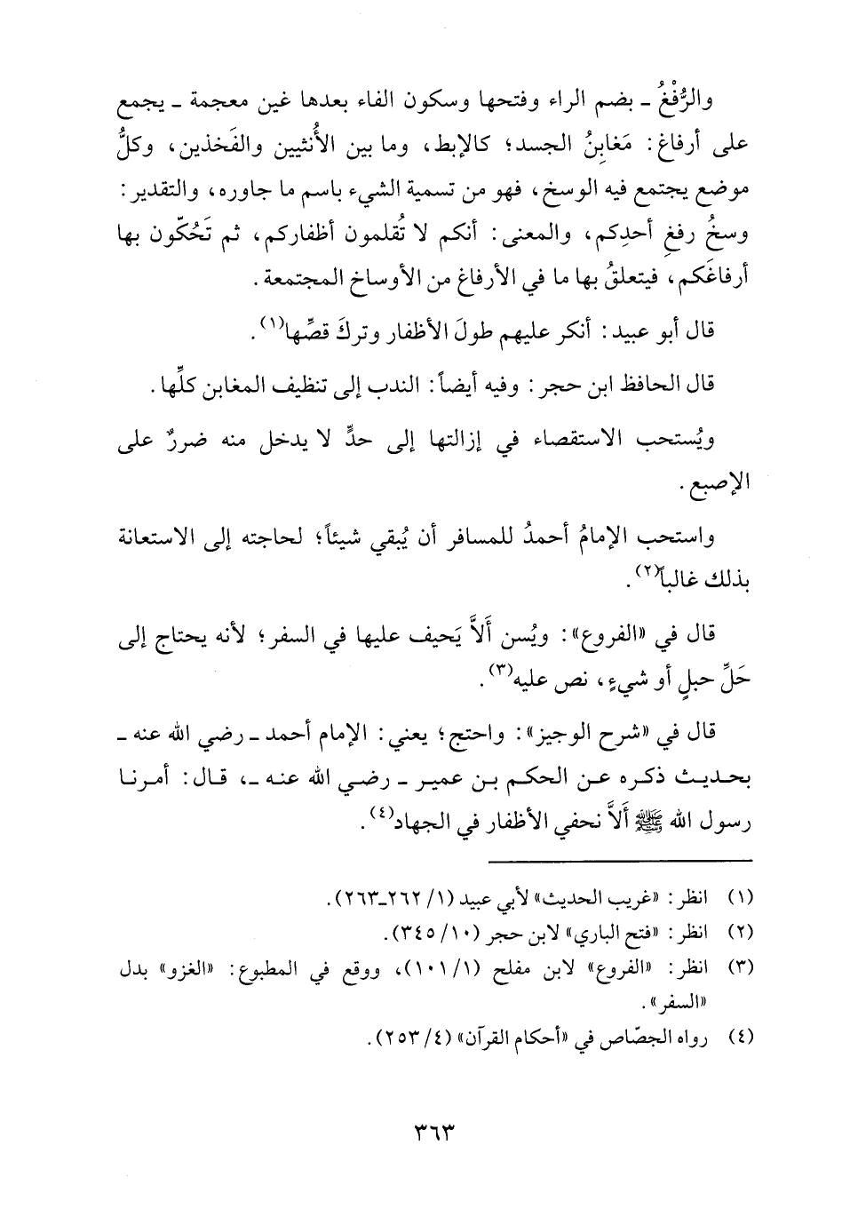 قال في "شرح الوجيز": واحتج، يعني: الإمام أحمد - رضي الله عنه - بحديث ذكره عن الحكم بن عمير - رضي الله عنه -، قال: أمرنا رسول الله - صلى الله عليه وسلم - أَلَّا نحفي الأظفار في الجهاد (٤).
