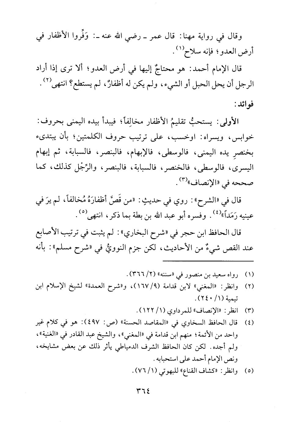 قال الإمام أحمد: هو محتاجٌ إليها في أرض العدو؛ ألا ترى إذا أراد الرجل أن يحل الحبل أو الشيء، ولم يكن له أظفارٌ، لم يستطع؟ انتهى (٢).