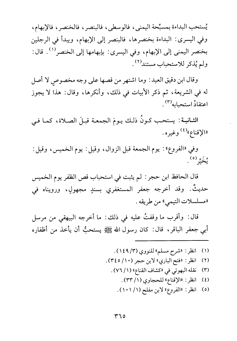 قال: وأقرب ما وقفتُ عليه في ذلك: ما أخرجه البيهقي من مرسل أبي جعفر الباقر، قال: كان رسول الله - صلى الله عليه وسلم - يستحبُّ أن يأخذ من أظفاره