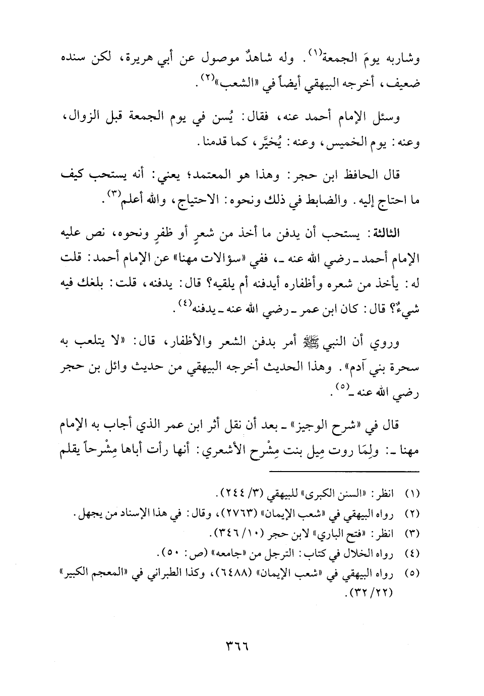 الثالثة: يستحب أن يدفن ما أخذ من شعرٍ أو ظفرٍ ونحوه، نص عليه الإمام أحمد - رضي الله عنه -، ففي "سؤالات مهنا" عن الإمام أحمد: قلت له: يأخذ من شعره وأظفاره أيدفنه أم يلقيه؟ قال: يدفنه، قلت: بلغك فيه شيءٌ؟ قال: كان ابن عمر - رضي الله عنه - يدفنه (٤).