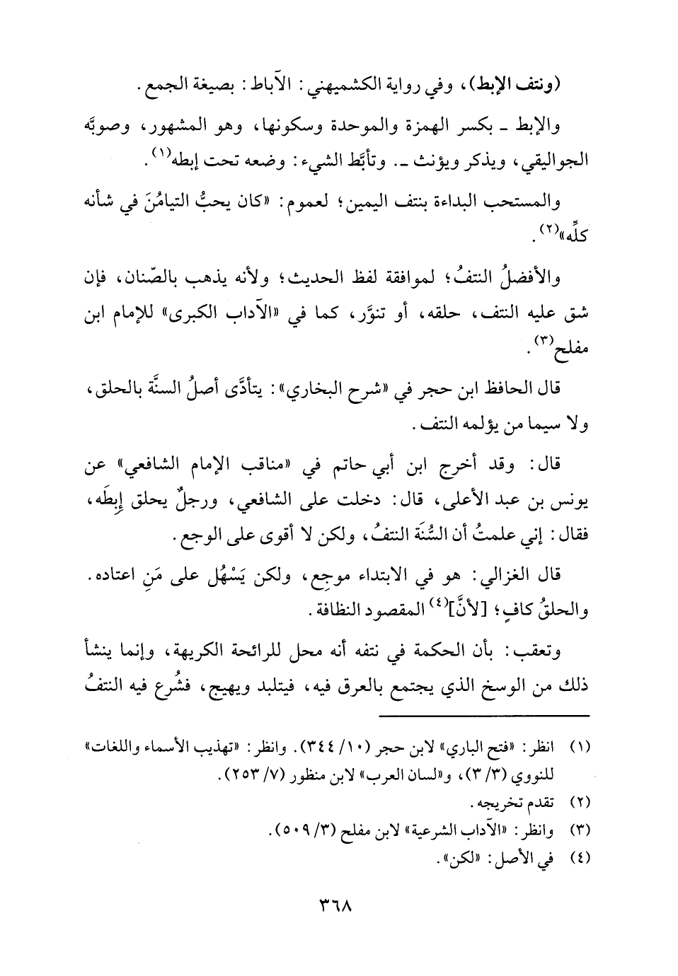 قال: وقد أخرج ابن أبي حاتم في "مناقب الإمام الشافعي" عن يونس بن عبد الأعلى، قال: دخلت على الشافعي، ورجلٌ يحلق إِبطَه، فقال: إني علمتُ أن السُّنَة النتفُ، ولكن لا أقوى على الوجع.