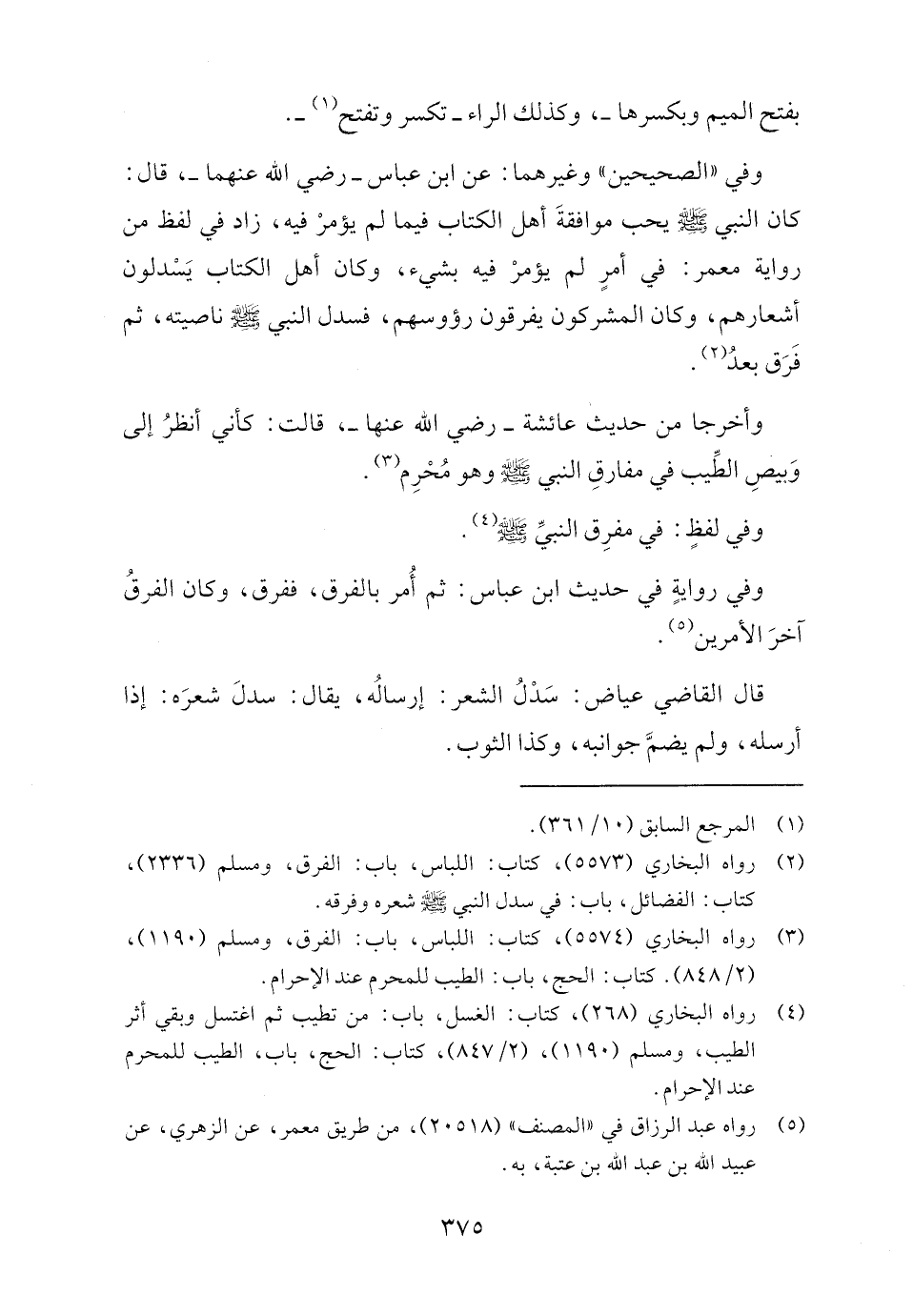 (٣) رواه البخاري (٥٥٧٤)، كتاب: اللباس، باب: الفرق، ومسلم (١١٩٠)، (٢/ ٨٤٨). كتاب: الحج، باب: الطيب للمحرم عند الإحرام.