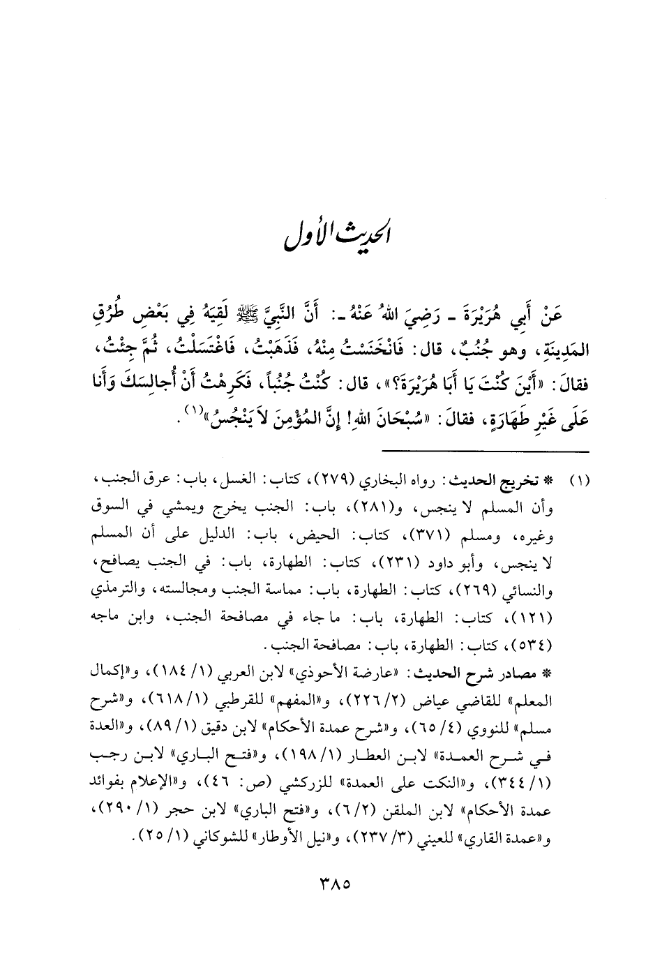 عَنْ أَبِي هُرَيْرَةَ - رَضِيَ اللهُ عَنْهُ -: أَنَّ النَّبِيَّ - صلى الله عليه وسلم - لَقِيَهُ فِي بَعْضِ طُرُقِ المَدِينهِ، وهو جُنُبٌ، قال: فَانْخَنَسْتُ مِنْهُ، فَذَهَبْتُ، فَاغْتَسَلْتُ، ثُمَّ جِئْتُ، فقالَ: "أَيْنَ كنتَ يَا أَبَا هُرَيْرَةَ؟ "، قال: كُنْتُ جُنُباً، فَكَرِهْتُ أَنْ أُجالِسَكَ وَأَنا عَلَى غَيْرِ طَهَارَةٍ، فقالَ: "سُبْحَانَ اللهِ! إنَّ المُؤْمِنَ لاَ يَنْجُسُ" (١).