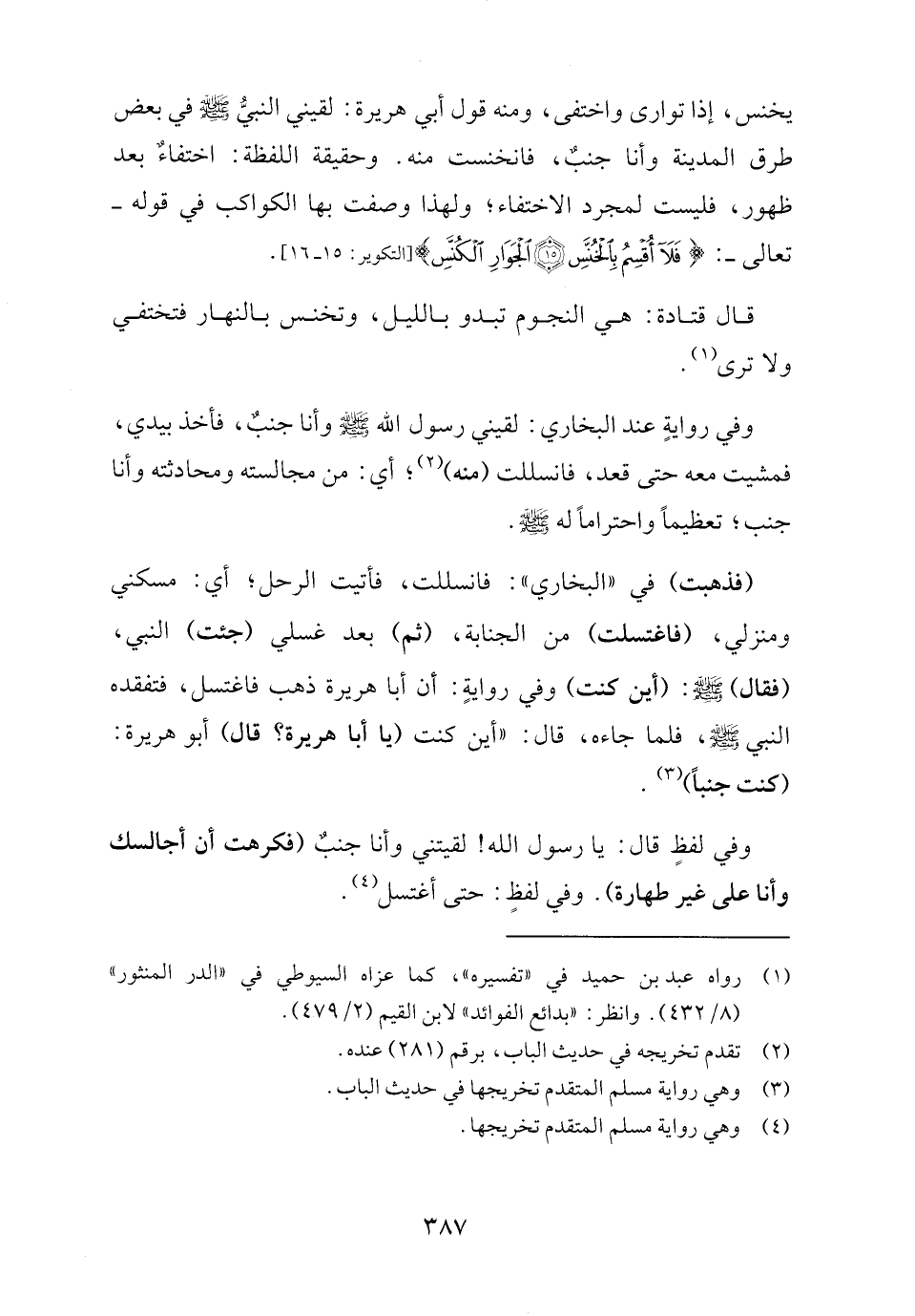 وفي لفظٍ قال: يا رسول الله! لقيتني وأنا جنبٌ (فكرهت أَن أجالسك وأنا على غير طهارة). وفي لفظٍ: حتى أغتسل (٤).